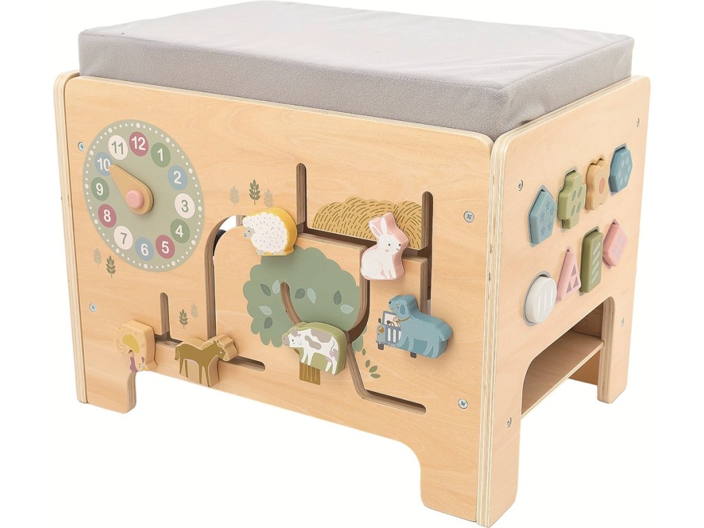 Keď si dieťa sadne, neznamená to, že sa prestane hýbať. Aspoň nie s touto motorickou stoličkou! Na prvý pohľad vyzerá ako obyčajné sedátko, ale pozor, pod sedákom sa ukrýva kresliaca tabuľka a po stranách je pripravená kopa aktivít, ktoré zamestnajú malé ručičky aj hlavičky. Labyrint so zvieratkami, vkladacie tvary, ozubené kolieska, hodiny, zrkadlo… Táto stolička je malá, ale neskutočne akčná. A k tomu všetkému ladená do prírodných a pastelových tónov, takže sa stane aj atraktívnym doplnkom detskej izby či herne. Stolička je dodávaná v nezloženom stave. Nutná montáž dospelou osobou. Hlavné vlastnosti: multifunkčná stolička so sedákoms množstvom aktivítkombinácia prírodného dreva a pastelových fariebrozvíja jemnú motoriku, logické myslenie a kreativitustabilné a kvalitné drevené prevedenienutná montáž dospelou osobouvhodné pre deti od 2 rokov