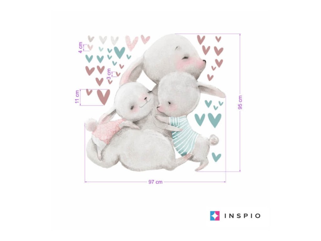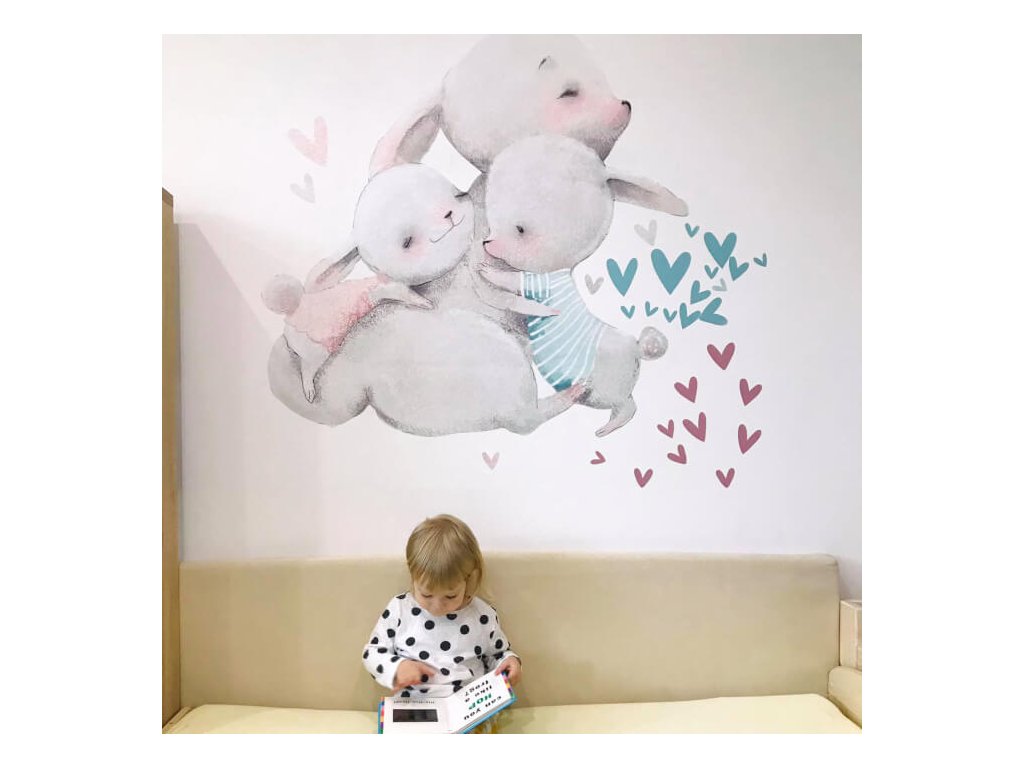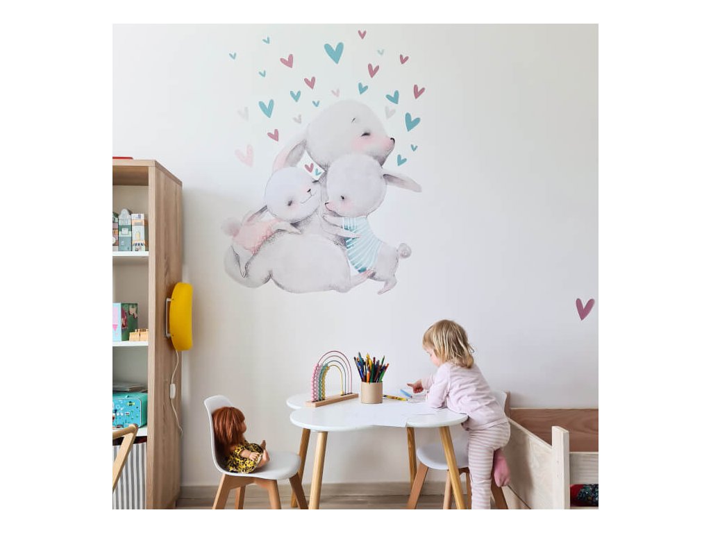Akvarelová nálepka na stenu - Rodinka zajačikov so srdiečkami