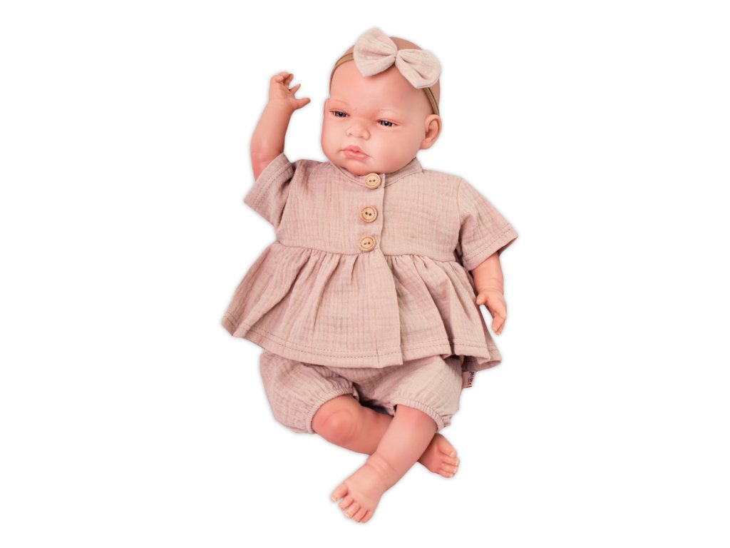Baby Nellys 3-dílná mušelínová soupravička, tunika/halenka, kraťasky, čelenka, béžová
