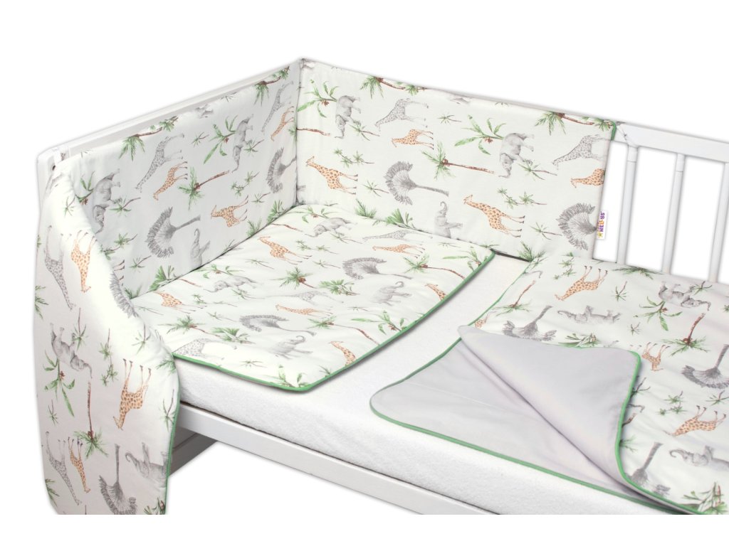 Baby Nellys 3-dílná sada mantinel s povlečením Safari - bílá s potiskem/zelená