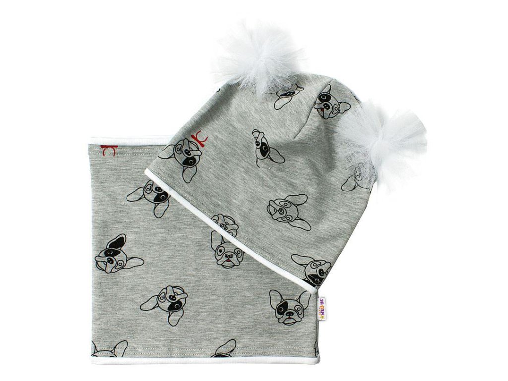 Baby Nellys Bavlněná sada čepička s tutu a nákrčník Pejsci - šedá, bílá,ekri