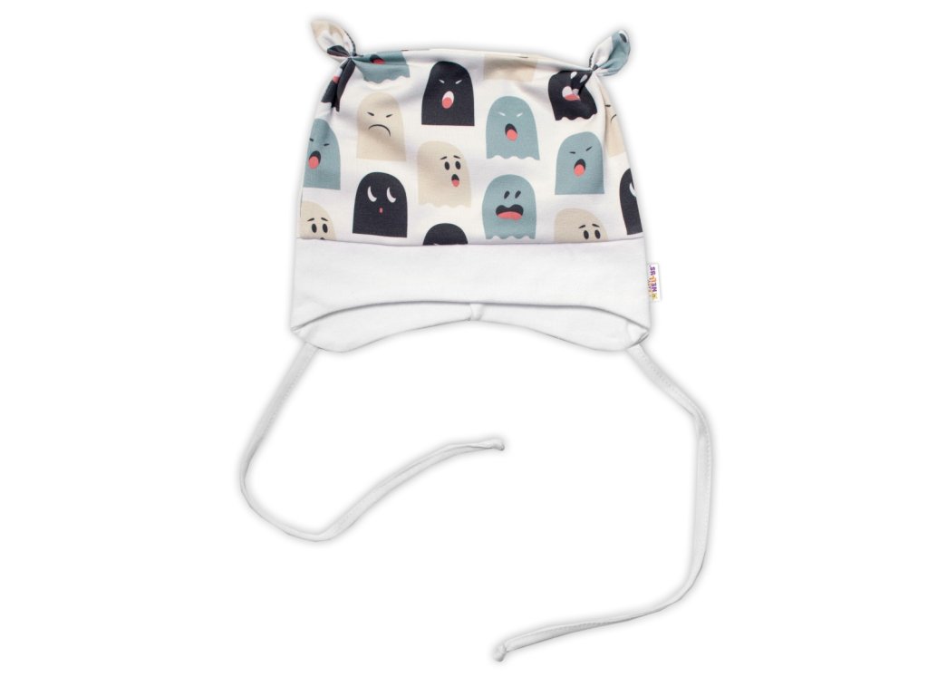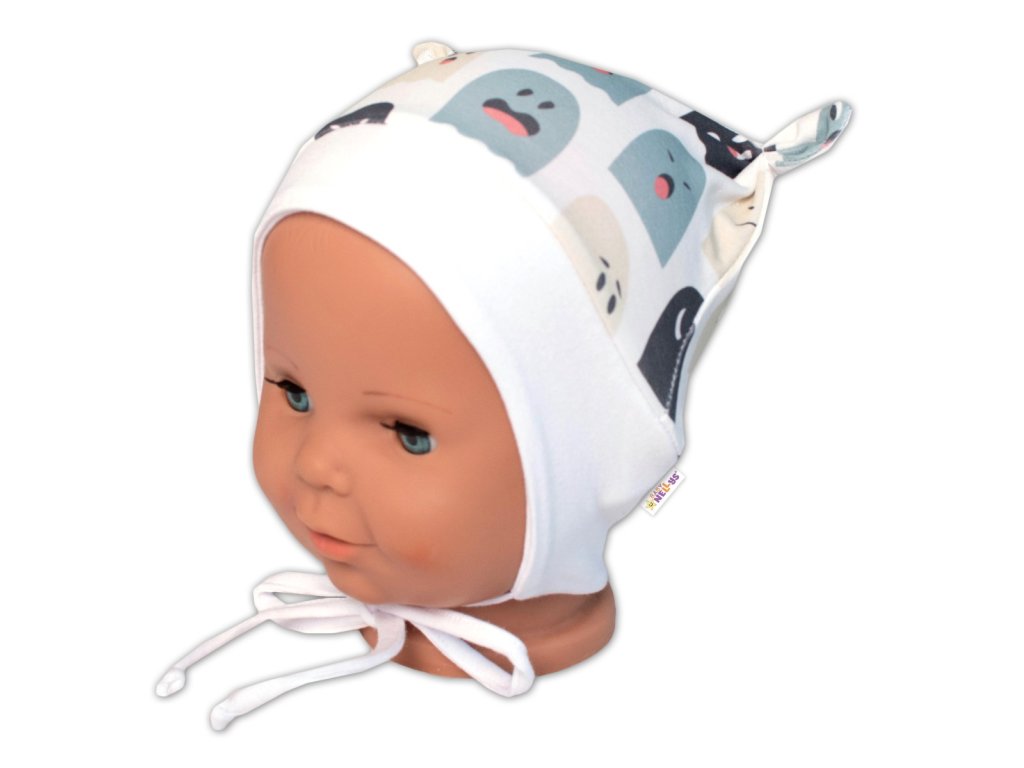 Baby Nellys Kojenecká čepička uzlíček na zavazování - Příšerky, bílá/mátová , vel. 68/74