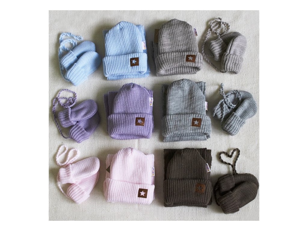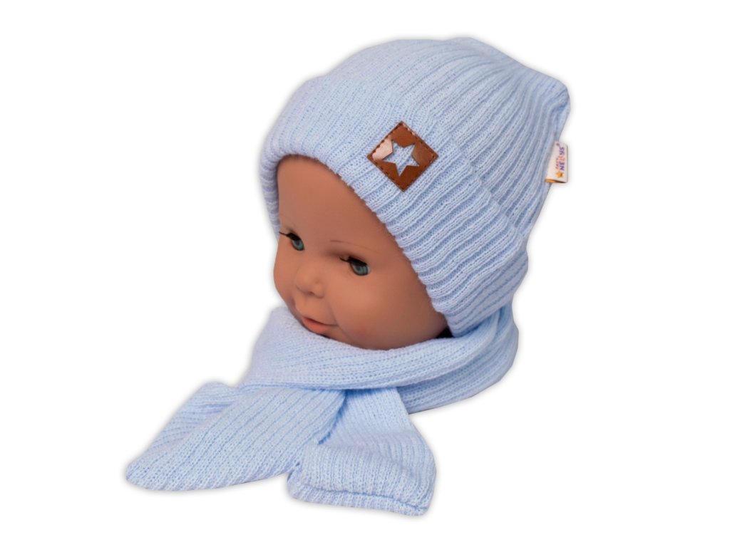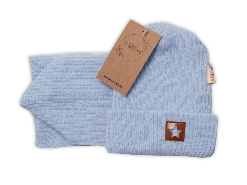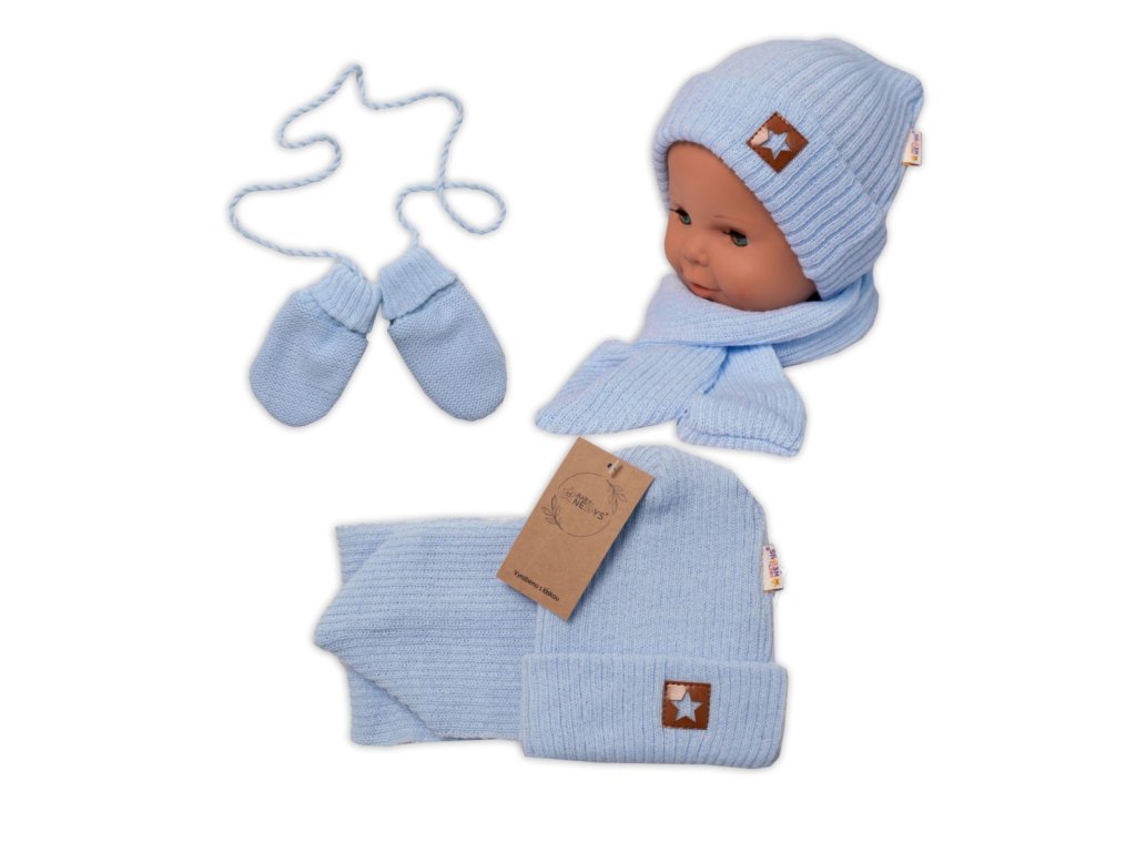 Baby Nellys Pletená čepice s šálou a rukavičky 3v1, STAR - sv. modrá