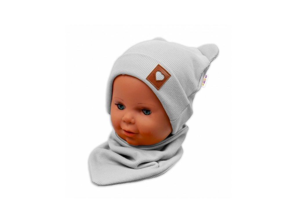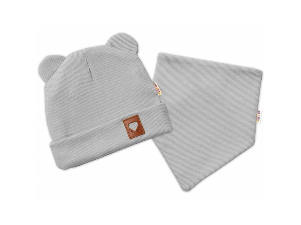Baby Nellys Rebrovaná dvojvrstvová čiapka s uškami + šatka TEDDY - sivá