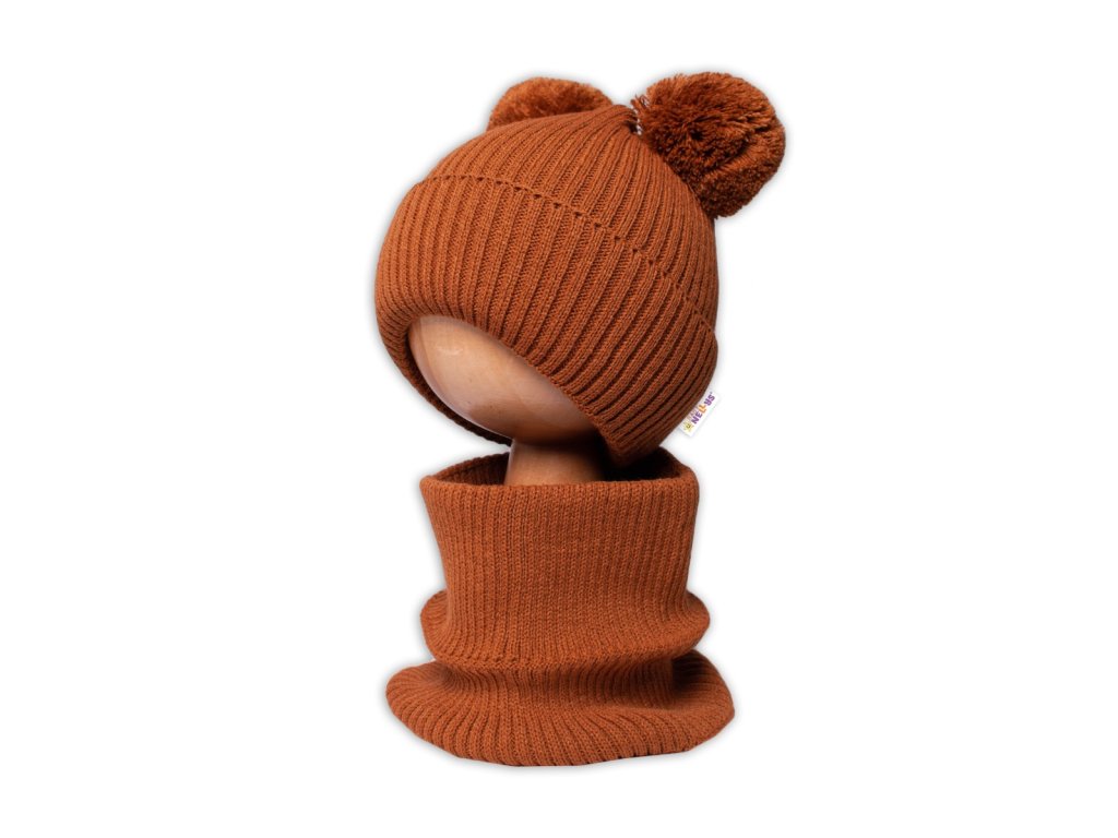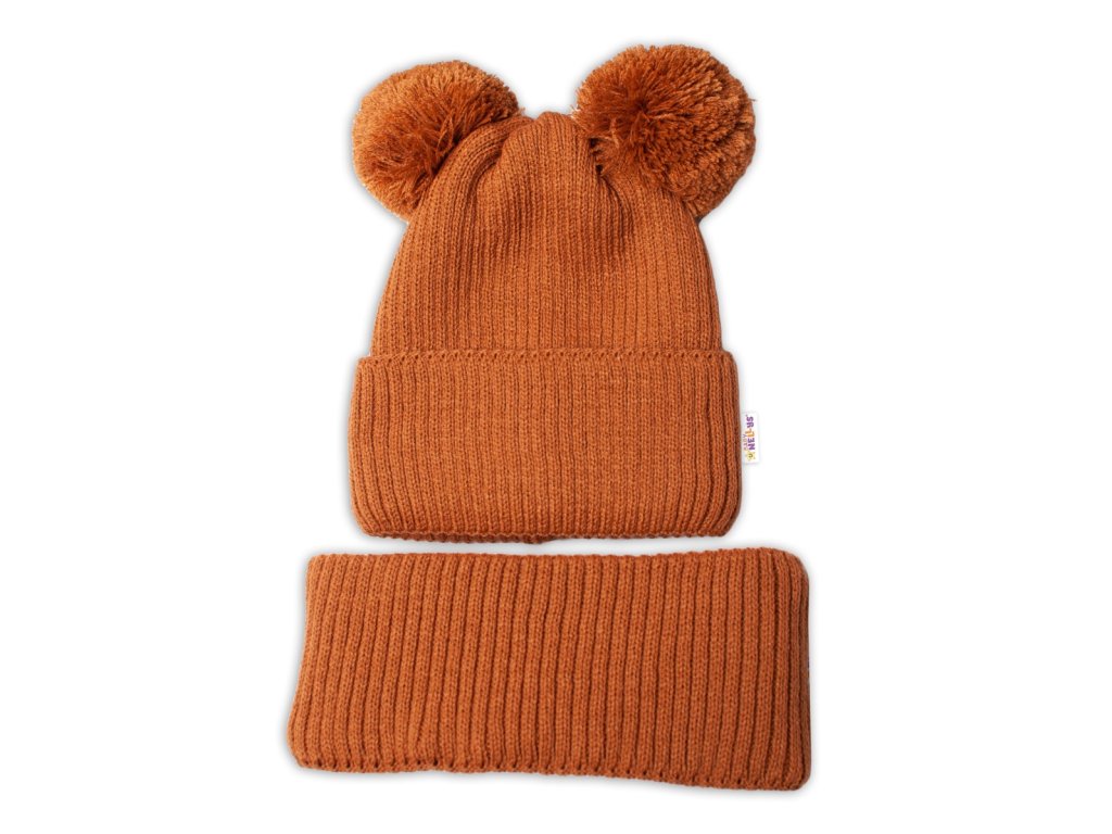 BABY NELLYS Zimná pletená čiapka + nákrčník - hnedá s brmbolcami