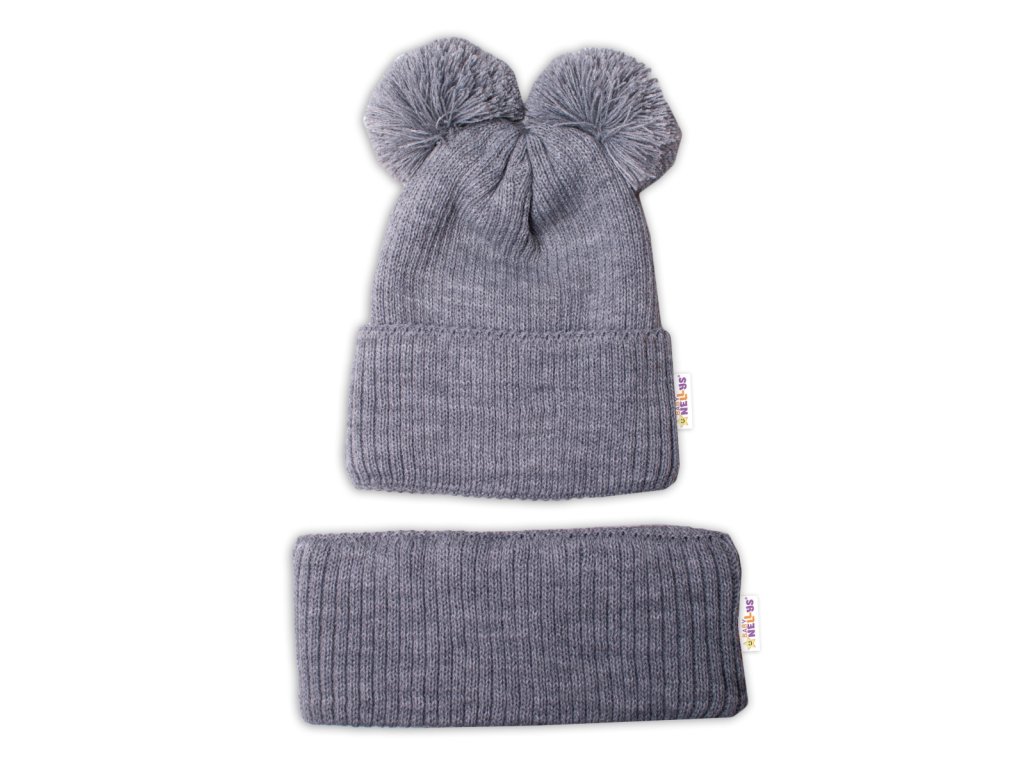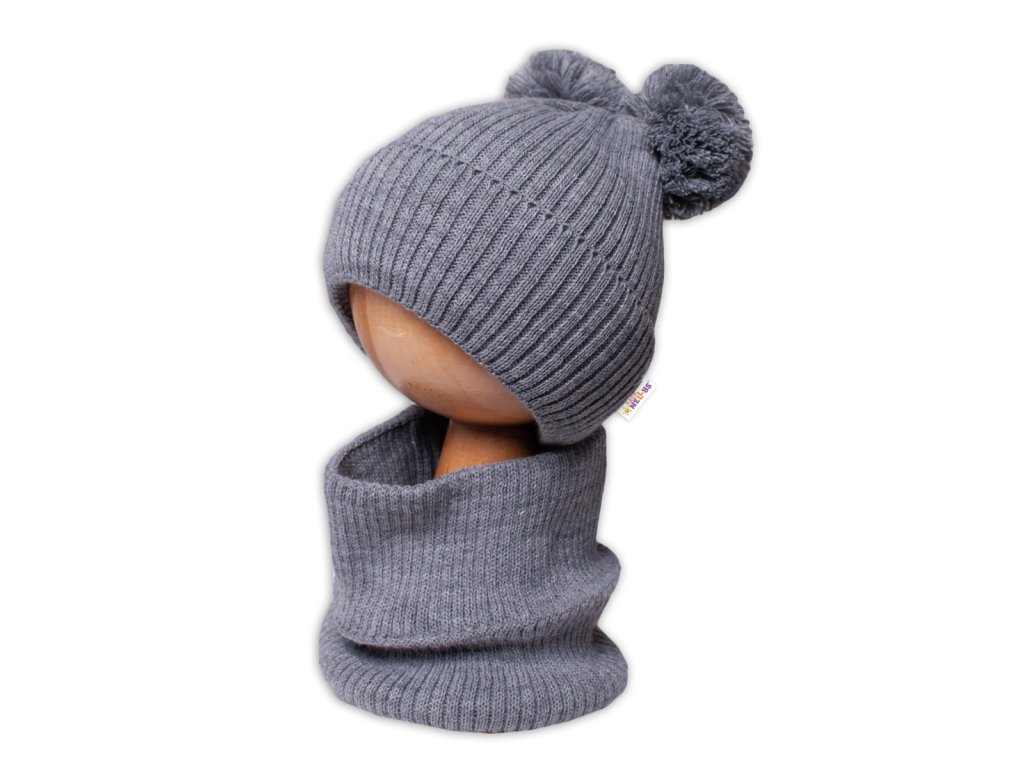 BABY NELLYS Zimná pletená čiapka + nákrčník - sivá s brmbolcami