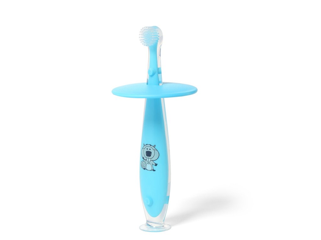 Jemná silikónová zubná kefka so zarážkou, ktorá zabraňuje jeho príliš hlbokému vloženie do úst.