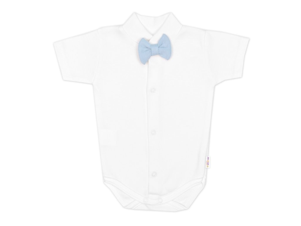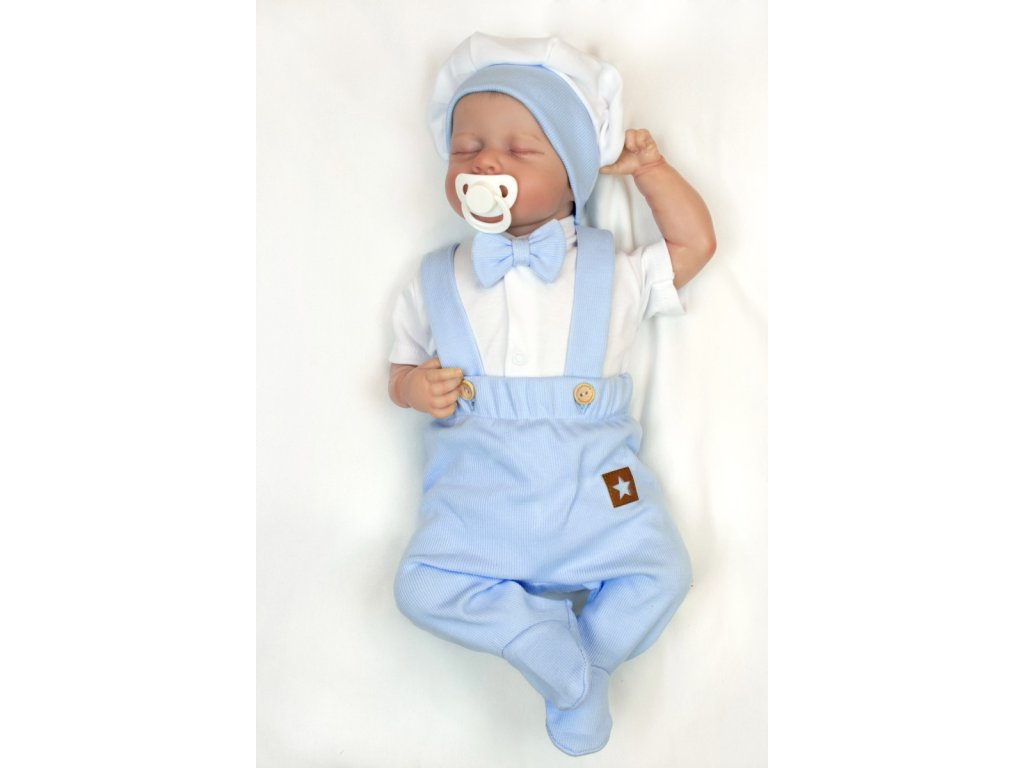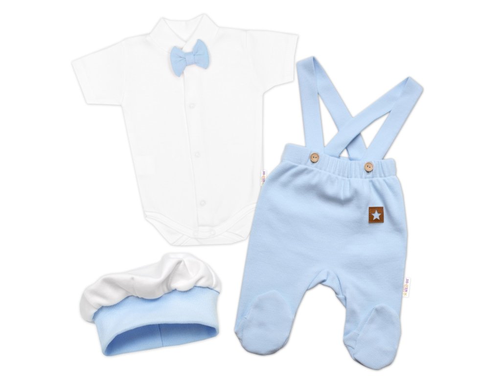 Bavlněná souprava Gentleman 3D, body kr. rukáv, polodupačky s láclem + čepička, modrá/bílá