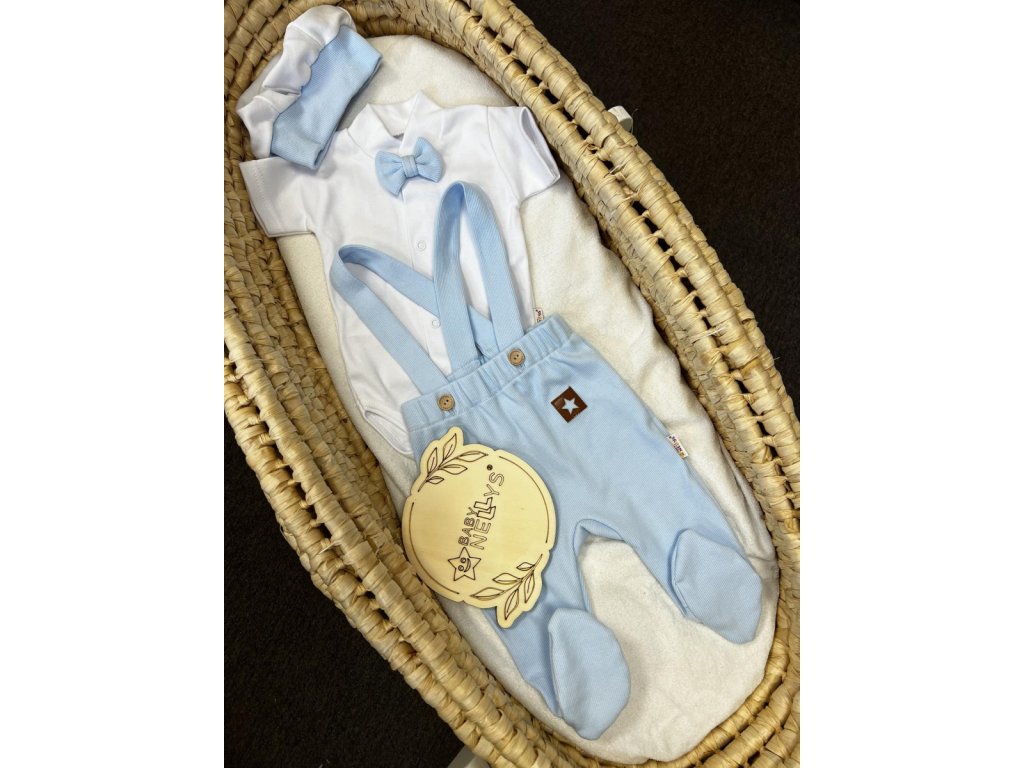 Tato bavlněná souprava je určena pro malé gentlemeny, kteří milují šarm a eleganci. Obsahuje celorozpínací body s krátkým rukávem a nádherným motýlkem, který není odnímatelný, polodupačky s láclem z žebrovaného bavlněného materiálu a roztomilým baretem, která dodává celému outfitu šmrnc.