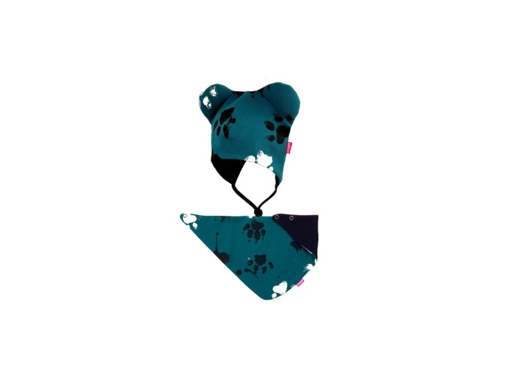 Bexa dvouvrstvá čepice na zavazování s oušky + šátek - Tlapky, petrolejová