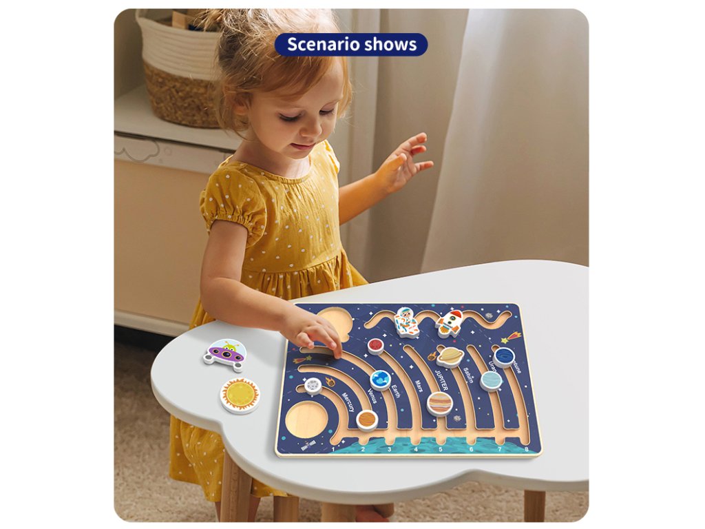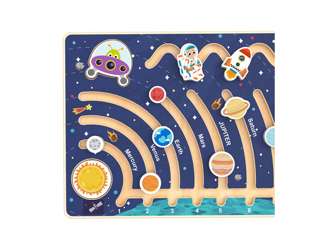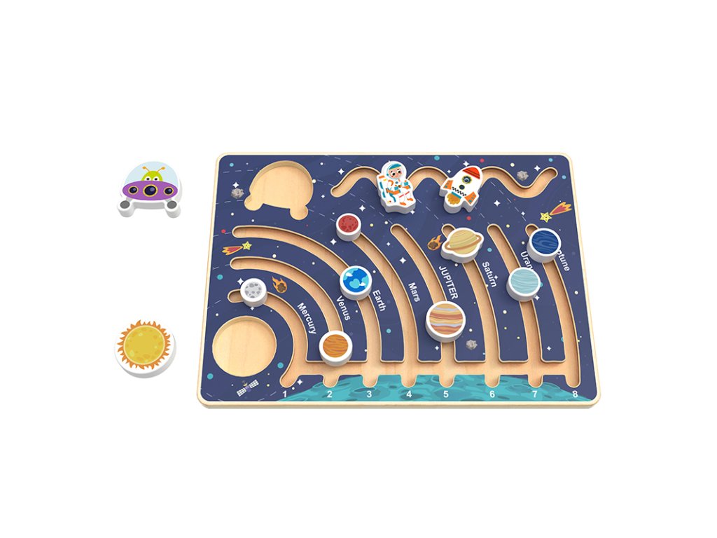 Bludisko Slnečná sústava Motorické bludisko vhodné od 18 mesiacov Drevený motorický labyrint so Slnečnou sústavou a ďalšími vesmírnymi objektmi od Tooky Toy zaujme deti už od 18 mesiacov, ale učiť sa s ním budú aj predškoláci. Originálna bludisko obsahuje celú Slnečnú sústavu so všetkými planétami, ktorými je možné pohybovať v rámci vyznačených koľají. Nechýba ani vkladacie slnko a ďalšie objekty, ako je ufo, raketa či astronaut.Deti sa učia hrou Originálne drevené bludisko Slnečná sústava rozvíja jemnú motoriku, koordináciu pohybov, schopnosť sústredenia, pozorovacie aj logické schopnosti. Drevené hračky pre deti od Tooky Toy sú vyrobené z pevného dreva z udržateľného lesníctva, natreté netoxickými farbami a pre deti sú bezpečné.
