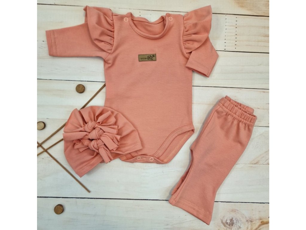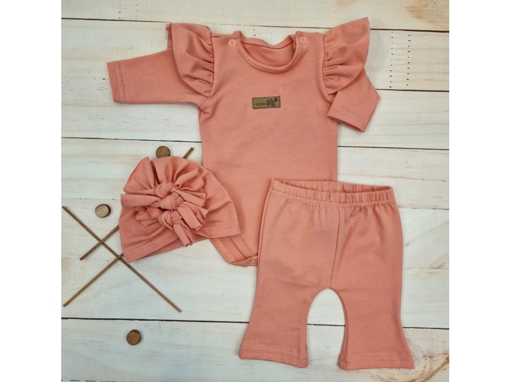 Body s volánky, legíny do zvonu a čepička, 3D, bavlna, meruňková
