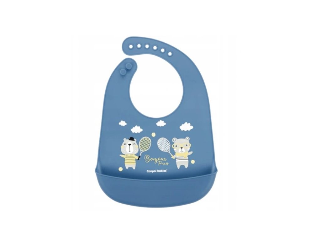 Mäkký silikónový podbradník s veľkou praktickou kapsou, ktorá chráni oblečenie pred zašpinením.