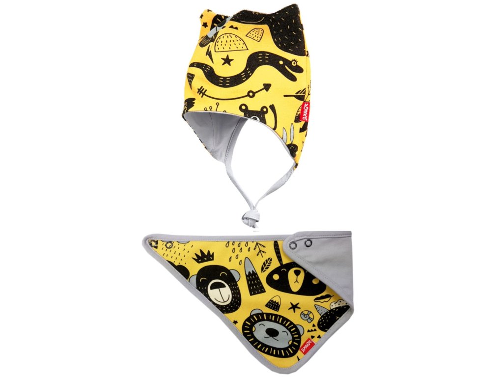 Čepice dvouvrstvá na zavazování + šátek, Zvířátka, Bexa - hořčicová