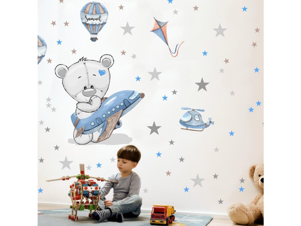 INSPIO nálepka macka s lietadlom a menom je skvelým doplnkom do schlapčenskej izbičky.