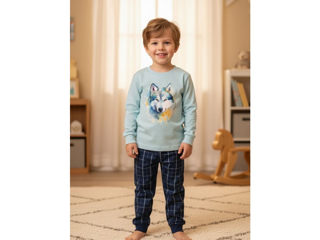 Originálne chlapčenské pyžamo s vlčím motívom WOLF. Vrchný diel pyžama zdobí výrazná ilustrácia vlka v akvarelovom štýle. Vyrobené z kvalitnej bavlny, je mäkké, priedušné a príjemné na dotyk. Tmavomodré nohavice s bielym kockovaným vzorom a elastickým pásom zabezpečujú maximálne pohodlie pri každom pohybe. Detské pyžamo pre chlapcov má dlhé rukávy a nohavice, ideálne do chladnejších nocí. Pohodlný strih podporuje voľnosť pohybu a nerušený spánok.