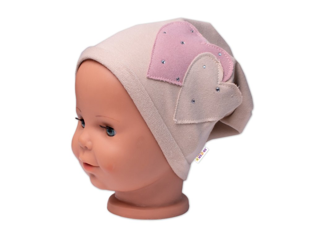 Dětská čepice bavlna, Srdíčka s kamínky, Baby Nellys, béžová