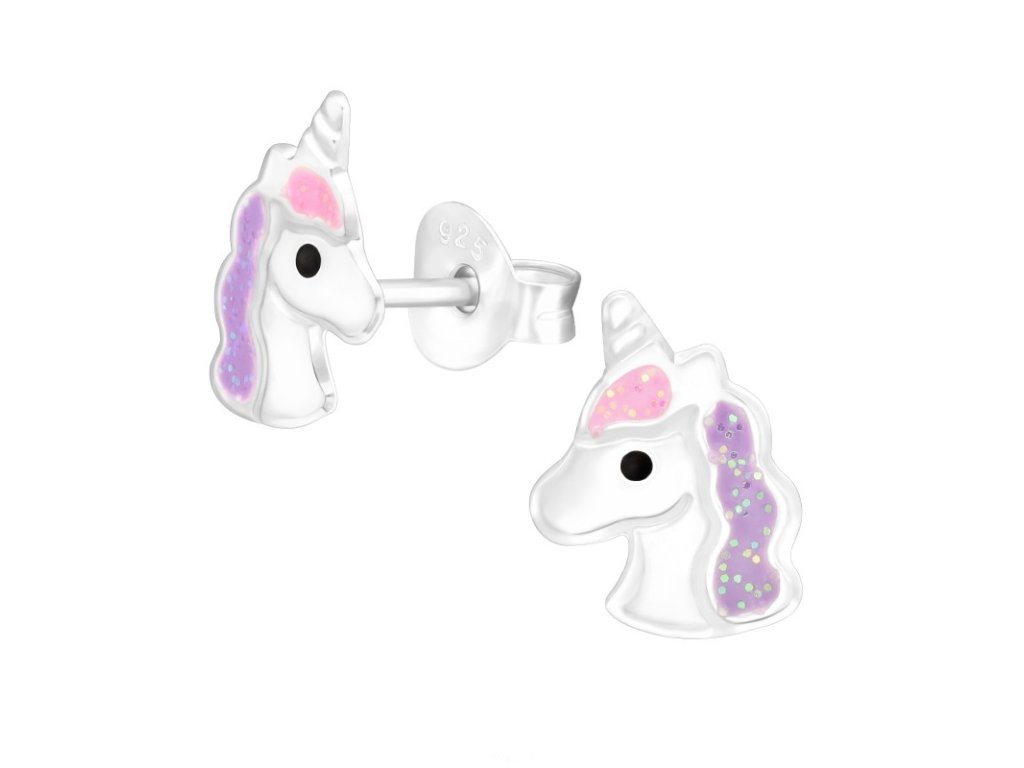 Detské strieborné náušničky Jednorožec Glitter, puzetové
