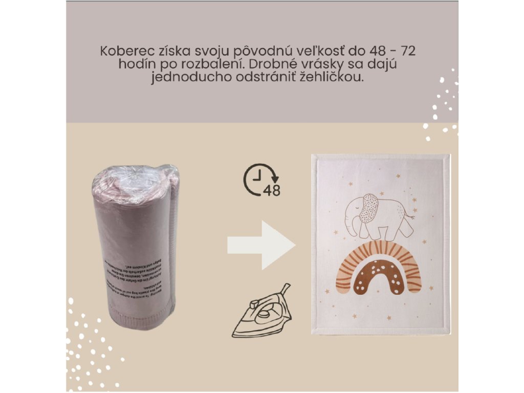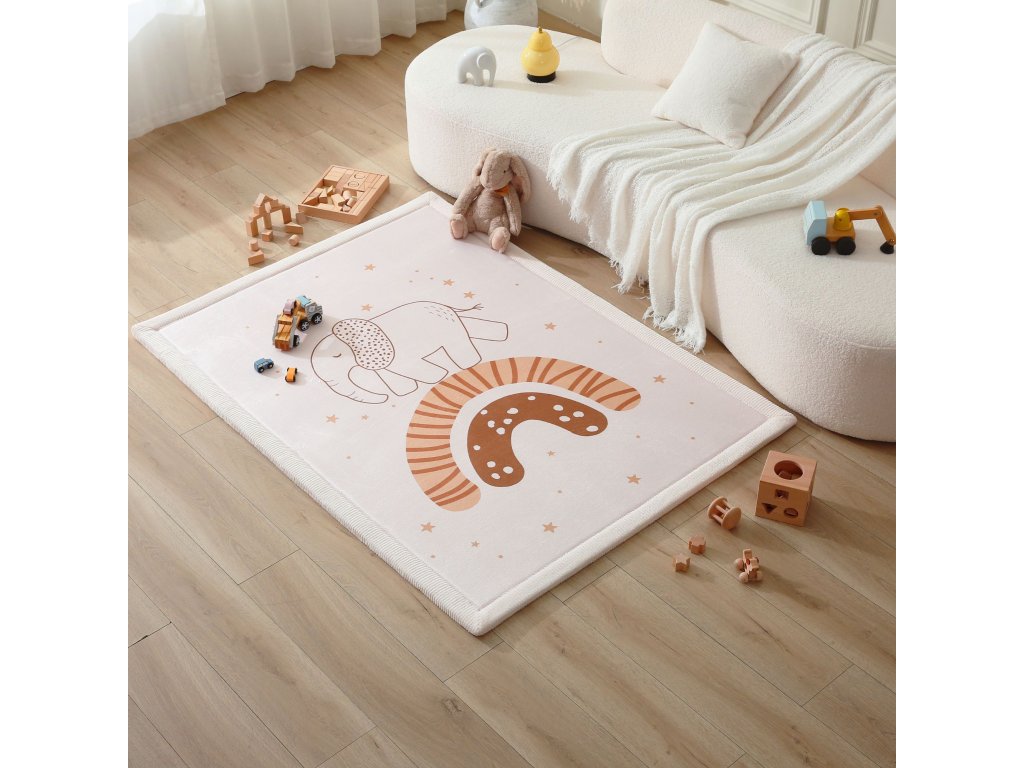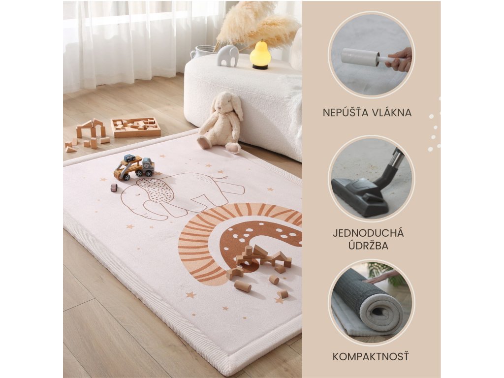 Detský koberec Rainbow Elephant 1.7 x 1.2 m Bezpečné a pohodlné miesto na hranie Detský koberec Rainbow Elephant je skvelým miestom pre deti na hranie, lezenie aj oddych. Má tri vrstvy – mäkký koralový zamat, pohodlnú elastickú pamäťovú penu a protišmykovú podložku, ktoré zaručia bezpečné a pohodlné hranie na zemi. Pamäťová pena je hrubá 2 cm a rýchlo sa vracia do pôvodného tvaru, čo je výhodou oproti lacnejším kobercom. S rozmermi 170 x 120 x 2 cm je dostatočne veľký nielen na detské hry, ale aj na jogu alebo relax.Štýlový a praktický doplnok do domácnosti Detský koberec s motívom sloníka krásne doplní váš interiér. Jeho praktický dizajn umožňuje jednoduchú starostlivosť a ľahkú údržbu – stačí ho povysávať alebo utrieť vlhkou handričkou. Navyše, je vyrobený bez škodlivých látok ako sú BPA či ftaláty, takže si môžete byť istí, že vaše dieťa bude v bezpečí.