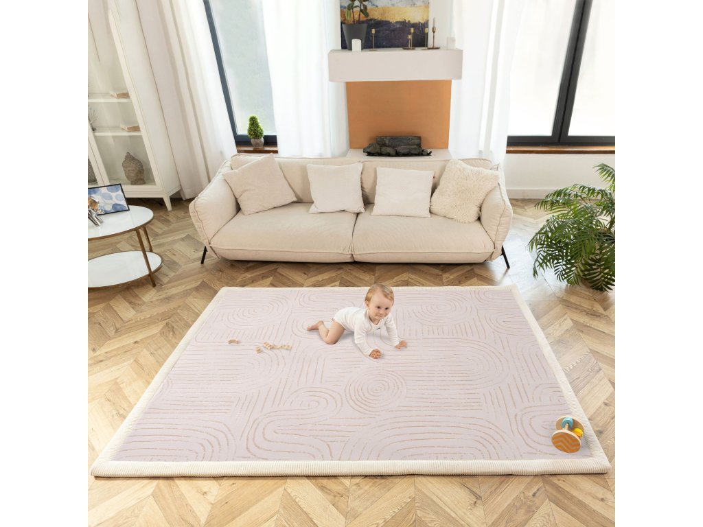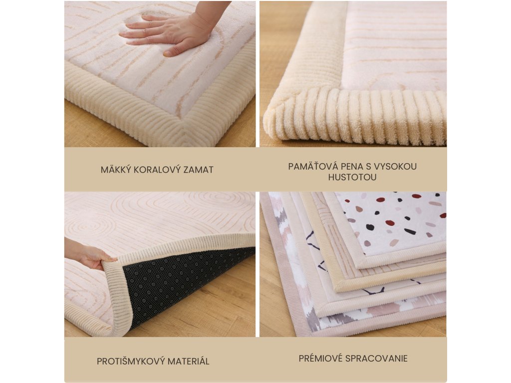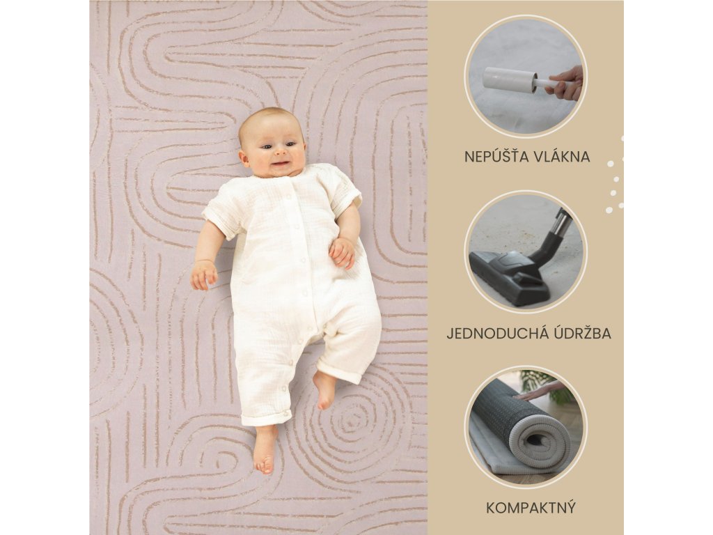 Detský koberec Zen Garden 2 x 1.5 m Bezpečné a pohodlné miesto na hranie Detský koberec Zenová záhrada je skvelým miestom pre deti na hranie, lezenie aj oddych. Má tri vrstvy – mäkký koralový zamat, pohodlnú elastickú pamäťovú penu a protišmykovú podložku, ktoré zaručia bezpečné a pohodlné hranie na zemi. Pamäťová pena je hrubá 2,5 cm a rýchlo sa vracia do pôvodného tvaru, čo je výhodou oproti lacnejším kobercom. S rozmermi 200 x 150 x 2,5 cm je dostatočne veľký nielen na detské hry, ale aj na jogu alebo relax.Štýlový a praktický doplnok do domácnosti Detský koberec s modernými vzormi v pastelových farbách dokonale zapadne do vašej obývačky alebo detskej izby a dodá pocit harmónie a pohodlia. Jeho praktický dizajn umožňuje jednoduchú starostlivosť a ľahkú údržbu – stačí ho povysávať alebo utrieť vlhkou handričkou. Navyše, je vyrobený bez škodlivých látok ako sú BPA či ftaláty, takže si môžete byť istí, že vaše dieťa bude v bezpečí.