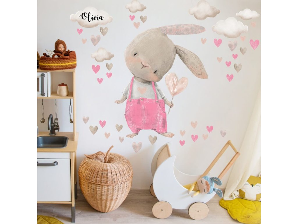 Dokonalá INSPIO nálepka do detskej izby - rozkošný zajačik v akvarelovom prevedení s menom a srdiečkami.
