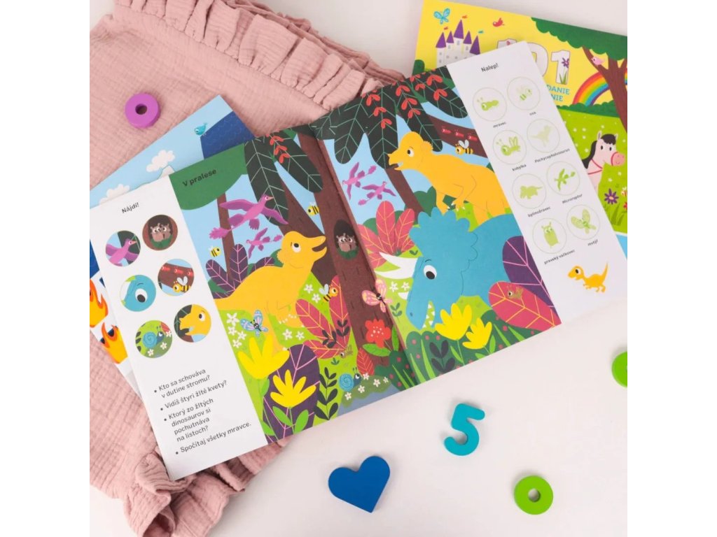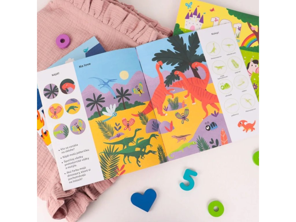 Nič nebaví deti tak ako hľadanie obrázkov a dolepovanie samolepiek na stránky pracovného zošita. V tomto zošite si takéto aktivity užijú do sýtosti - čaká ich totiž viac ako 101 obrázkov. Niektoré budú najprv hľadať, ďalšie potom nalepia. Na každej dvojstrane objavia najrôznejšie dinosaury, prehistorický prales či výbuch sopky.