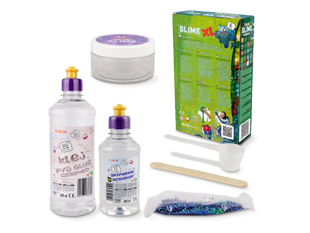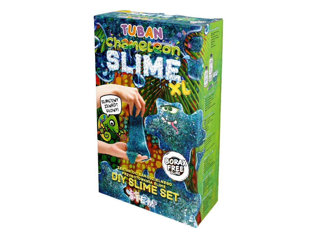 DIY Slime Sada na výrobu slizu Chameleón XL Ohúrte svoje deti čarovným, farbu meniacim slizom Skvelá aktivita pre deti, ktoré radi experimentujú. V tejto sade nájdete všetko, čo na výrobu kvalitného slizu potrebujete. Všetko ešte vo väčších množstvách! Využite sadu na hranie pre viac detí alebo si vytvorte sliz viackrát. Vďaka špeciálnej zmesi minerálnych trblietok bude mať sliz viacero neobyčajných odtieňov. Farby sa pri miesení slizu čarovne trblietajú a menia. Hra so slizom je ideálna na rozvoj jemnej motoriky, zmyslového vnímania a podporuje u detí kreativitu.Sada obsahuje:500 ml tyrkysového PVA lepidla,250 ml aktivátora,6 g minerálnych trblietok,špachtľu,odmerku,nádobu.Zábavný, edukačný, aj relaxačný Pre deti môže byť manipulácia so slizom upokojujúca a relaxačná. Je to skvelý spôsob, ako si oddýchnuť a znížiť stres po náročnom dni. Objavte všetky DIY slizy a hotové Jiggly slimes rôznych farieb a vôní.Sliz je vyrobený z bezpečných a netoxických materiálov, ktoré sú šetrné k životnému prostrediu, neobsahujú borax. Po hre odporúčame sliz uložiť do priloženej nádobky a dobre uzavrieť.Senzorická hra umožňuje deťom objavovať svet okolo seba prostredníctvom zmyslov Hranie s rôznymi textúrami, farbami a vôňami nielenže stimuluje ich zmyslové vnímanie, ale taktiež podporuje ich kognitívny vývoj, jemnú motoriku a emocionálnu inteligenciu. S produktmi značky Tuban môžu deti preskúmavať rôzne senzorické podnety a objavovať nové spôsoby učenia a zábavy.