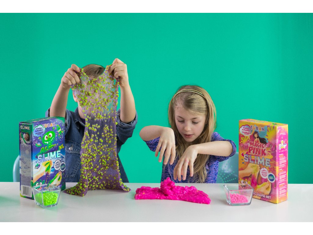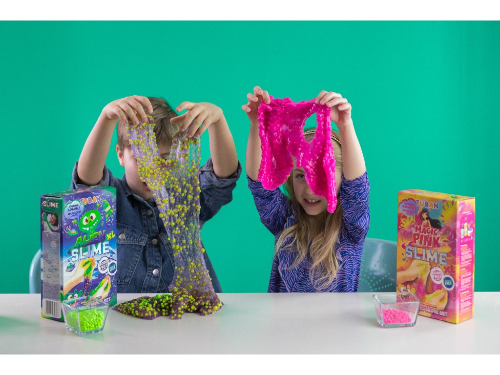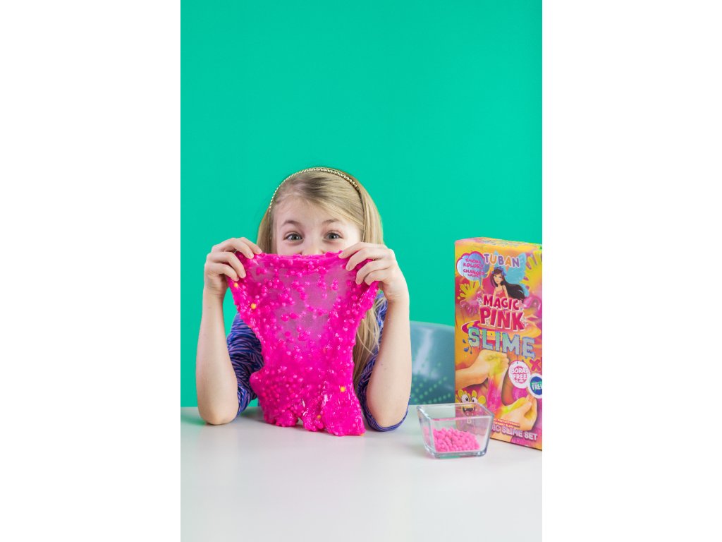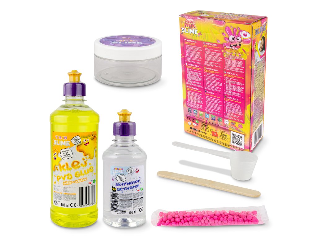 DIY Slime Sada na výrobu slizu Magická ružová XL Ohúrte svoje deti čarovným neónovo ružovým slizom Skvelá aktivita pre deti, ktoré radi experimentujú. V tejto sade nájdete všetko, čo na výrobu kvalitného slizu potrebujete. Všetko ešte vo väčších množstvách! Využite sadu na hranie pre viac detí alebo si vytvorte sliz viackrát. Vďaka špeciálnym ingredienciám žlté lepidlo zmení farbu slizu na neónovo ružový! Hra so slizom je ideálna na rozvoj jemnej motoriky, zmyslového vnímania a podporuje u detí kreativitu.Sada obsahuje:500 ml žltého PVA lepidla,250 ml aktivátora,10 g neónových minerálnych gulôčok,špachtľu,odmerku,nádobu.Zábavný, edukačný, aj relaxačný Pre deti môže byť manipulácia so slizom upokojujúca a relaxačná. Je to skvelý spôsob, ako si oddýchnuť a znížiť stres po náročnom dni. Objavte všetky DIY slizy a hotové Jiggly slimes rôznych farieb a vôní.Sliz je vyrobený z bezpečných a netoxických materiálov, ktoré sú šetrné k životnému prostrediu, neobsahujú borax. Po hre odporúčame sliz uložiť do priloženej nádobky a dobre uzavrieť.Senzorická hra umožňuje deťom objavovať svet okolo seba prostredníctvom zmyslov Hranie s rôznymi textúrami, farbami a vôňami nielenže stimuluje ich zmyslové vnímanie, ale taktiež podporuje ich kognitívny vývoj, jemnú motoriku a emocionálnu inteligenciu. S produktmi značky Tuban môžu deti preskúmavať rôzne senzorické podnety a objavovať nové spôsoby učenia a zábavy.