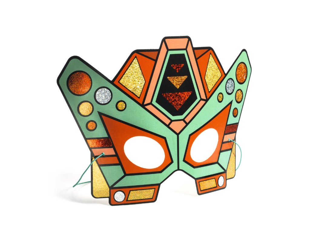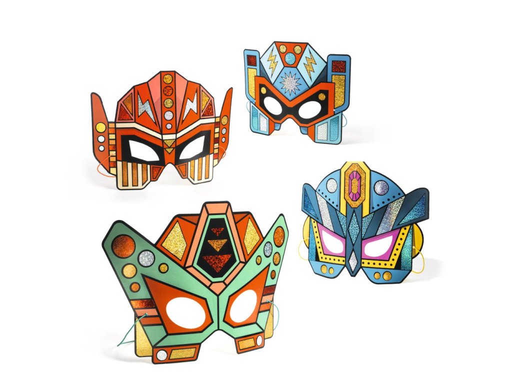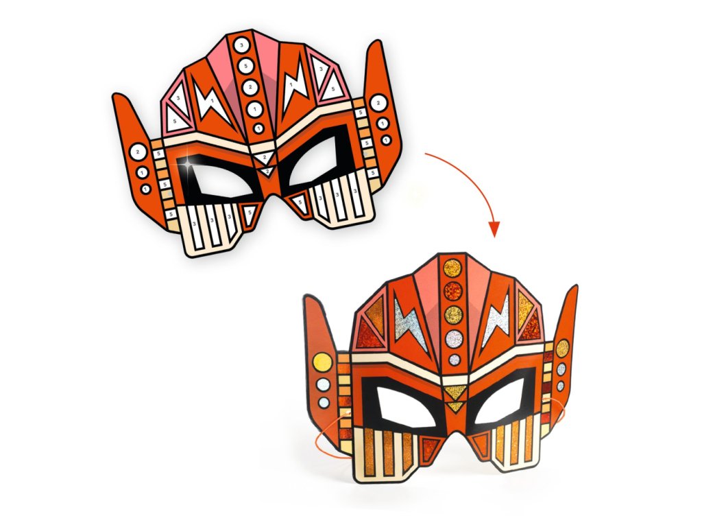 Kreatívna sada z kolekcie DIY od Djeco. Spája tvorenie s úžitkom. Dieťa ozdobí masky robotov farebnými fóliami s metalickým leskom. Masky majú lepivé plôšky s číslom pre farbu fólie. Dieťa pritlačí fóliu na plôšku a keď ju stiahne, plôška zostane farebná a lesklá - wow, nádhera! Maska drží gumičkou.