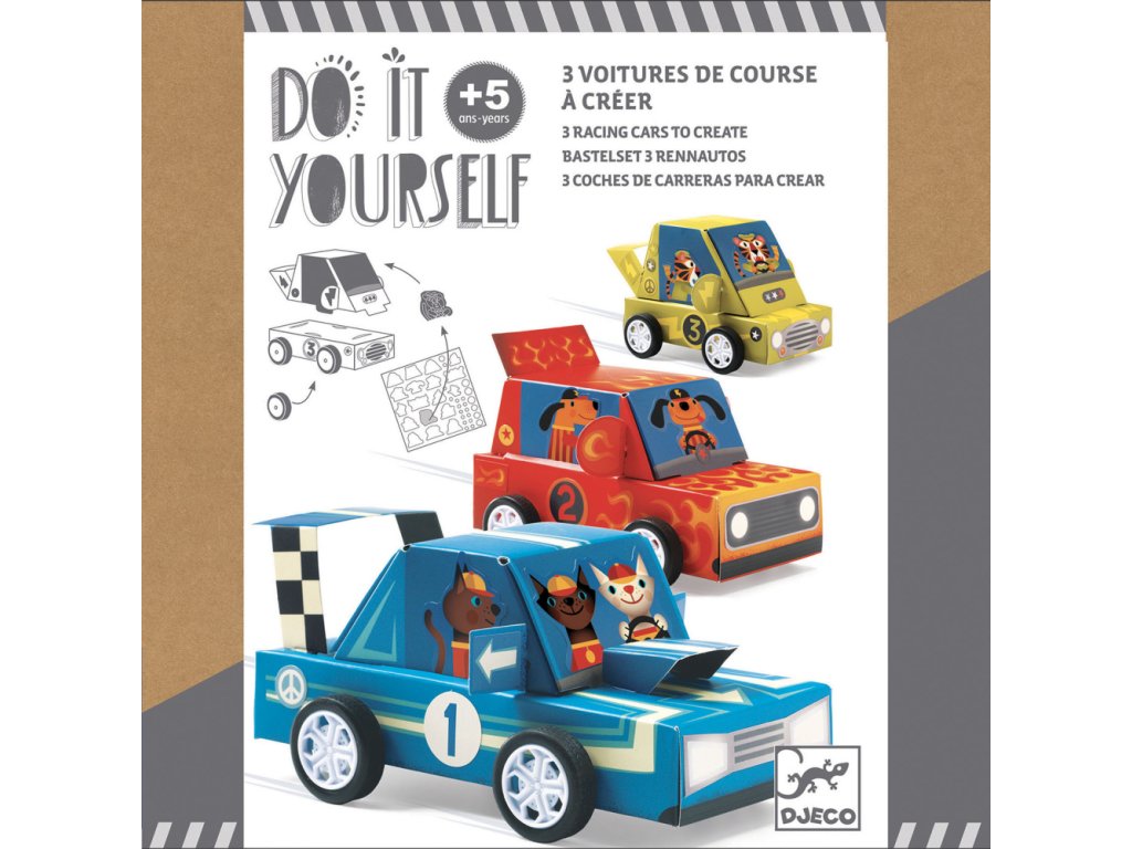 Kreatívna DIY sada 3 papierových pretekárskych áut na poskladanie a dotvorenie samolepkami. Poskladané karosérie stačí nasadiť na osky s kolesami a pustiť sa do pretekania! Pre deti od 5 rokov.