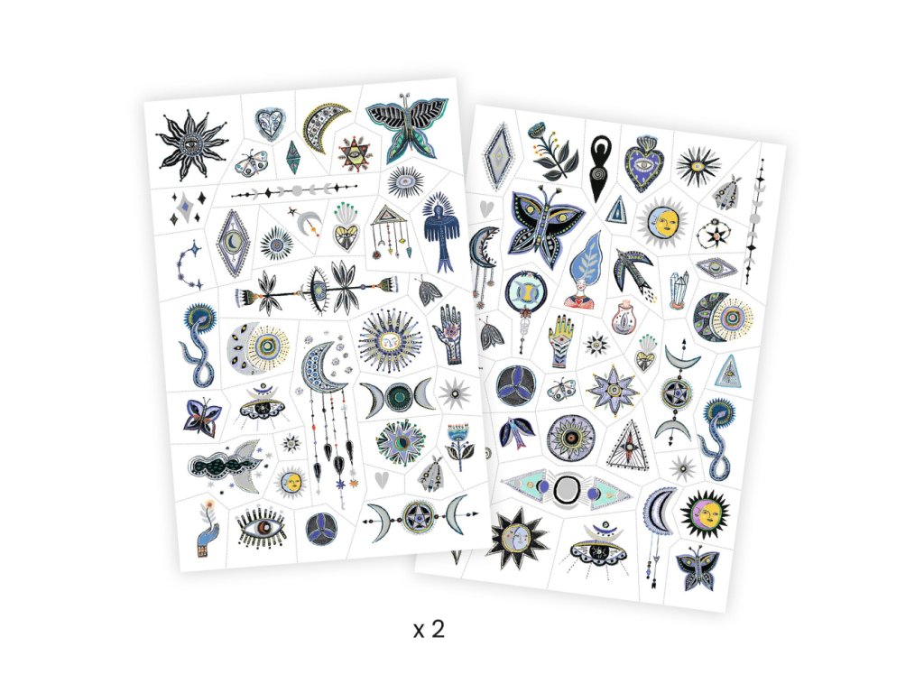 Dva hárky dočasných tetovaní Djeco inšpirovaných symbolmi bielej mágie! Tieto metalické vzory vás očaria Sú predrezané pre jednoduché použitie. Jednoducho preneste s trochou vody. Dermatologicky testované. Pre deti od 3 rokov.