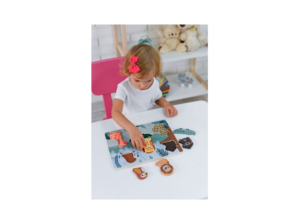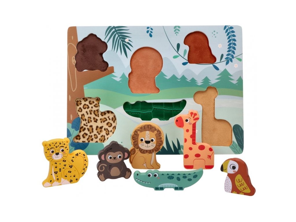 Hračka obsahuje 6 zvieratiek, ktoré dieťa priradia k tvaru na puzzle. Nájdete tu opicu, papagája, geparda, krokodíla, žirafu a leva. Navyše pod každou hádankou objavíte materiál s rôznymi štruktúrami.