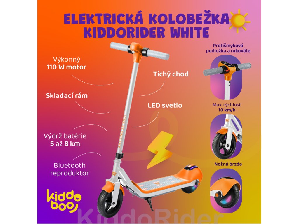 Elektrická kolobežka KiddoRider White Elektrická kolobežka pre deti s moderným dizajnom Hľadáš ideálny spôsob, ako dieťa zabaviť, rozhýbať a zároveň mu dopriať bezpečný dopravný prostriedok? Kiddoboo KiddoRider White je detská elektrická kolobežka, ktorá spája moderný dizajn, funkčnosť, radosť zo zvuku a bezpečnosť v jednom. Vďaka kompaktnému prevedeniu a intuitívnemu ovládaniu je vhodná pre deti už od 6 rokov – a zaručene z nej nebudú chcieť zliezť.Plynulá jazda s výkonom, ktorý zvládne detský svet Výkonný 110 W motor – ideálny na mestské chodníky či rodinné výletyMaximálna rýchlosť 10 km/h – dostatočne rýchla na zábavu, no bezpečnáVýdrž batérie až 8 km – optimálna vzdialenosť pre detské výletyBluetooth reproduktor - extra funkcia pre milovníkov hudbyBezpečnosť a pohodlie pre deti aj rodičov Protišmyková podložka a rukoväte – pre stabilitu počas celej jazdyNožná brzda – jednoduché a spoľahlivé zastavenieSkladací rám – ľahké prenášanie a uskladnenieDizajn, ktorý deti milujú Minimalistický biely vzhľad, ktorý pôsobí moderne a neutrálneLED svetlá pre zvýšenie viditeľnosti a štýluTichý chod, ktorý neruší a zvyšuje komfort jazdyKiddoboo elektrická kolobežka KiddoRider White je skvelý darček pre aktívne deti, ktoré milujú pohyb. Zábava, sloboda a bezpečnosť sa stretávajú v tejto elektrickej kolobežke navrhnutej s dôrazom na potreby mladých jazdcov.