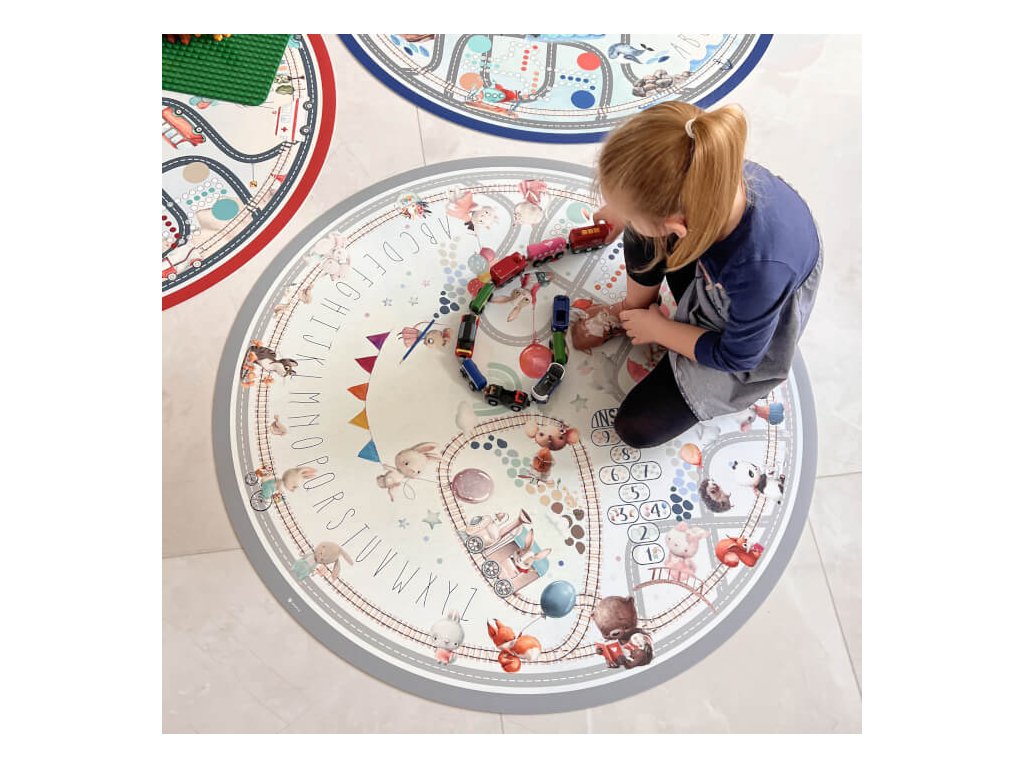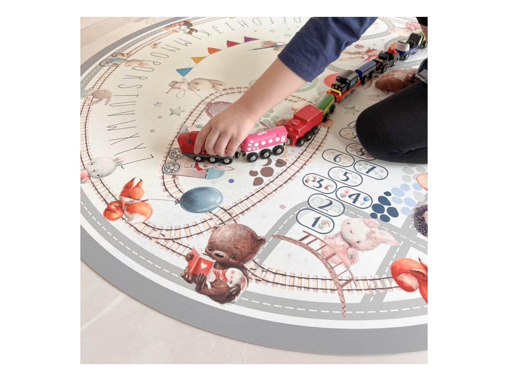 Detská podložka na hranie s cestou, koľajnicami a rôznymi dopravnými prostriedkami. Je príjemná na dotyk a ľahko sa udržiava.