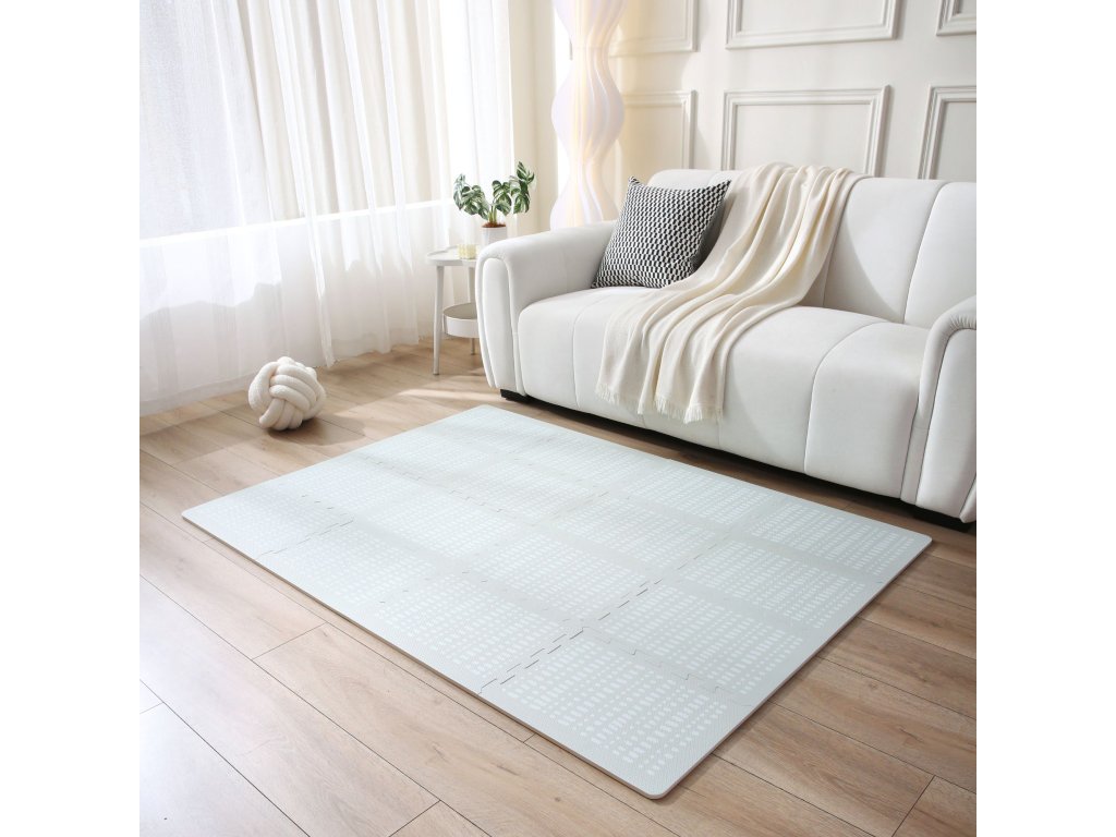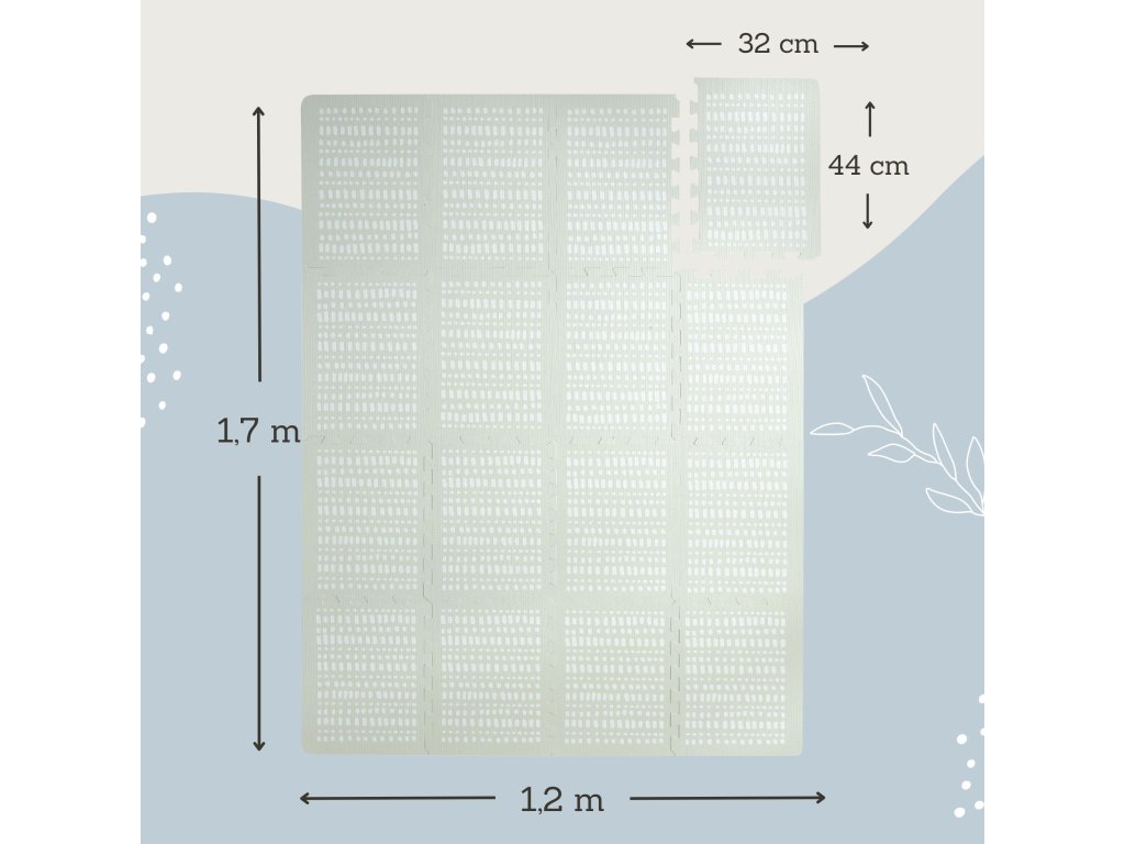 Hracia podložka Puzzle XL Hygge Grey 1.7 x 1.2 m Hravá a pohodlná puzzle podložka Extra veľká hracia podložka Puzzle XL v sivej farbe sa skladá zo 16 penových štvorcov, ktoré sú 4x väčšie ako klasické puzzle diely, preto poskytuje štvornásobok priestoru na plazenie, hranie a detské dobrodružstvá. S elegantnou sivou farbou a ručne kreslenými motívmi konfiet podložka nielenže ozdobí detskú izbu, ale poskytne aj pohodlný "vankúš" na tvrdých podlahách. Vďaka bezpečnému spojeniu sú dosky blízko seba, takže deti sa môžu bezstarostne hrať a objavovať svet okolo seba.Bezpečná hracia podložka pre najmenších Hracia podložka v béžovej farbe je vyrobená z kvalitnej EVA peny, ktorá je hrubá 1,2 cm a o 20% mäkšia a teplejšia ako iné alternatívy, čo zabezpečuje pohodlné a bezpečné hranie. Podložka je vodeodolná a jednoducho ju vyčistíte mydlom a handričkou, takže ju môžete používať nielen doma, ale aj vonku. Navyše, je 100% bez zápachu a neobsahuje nebezpečné látky ako formamid, BPA a ftaláty.