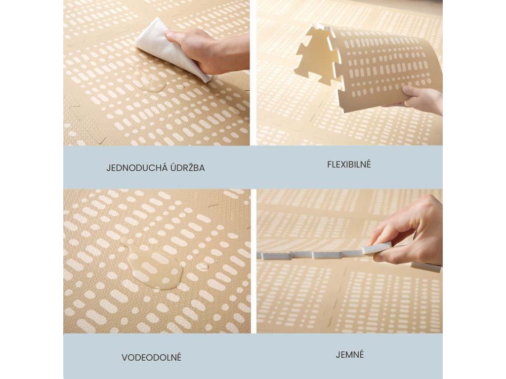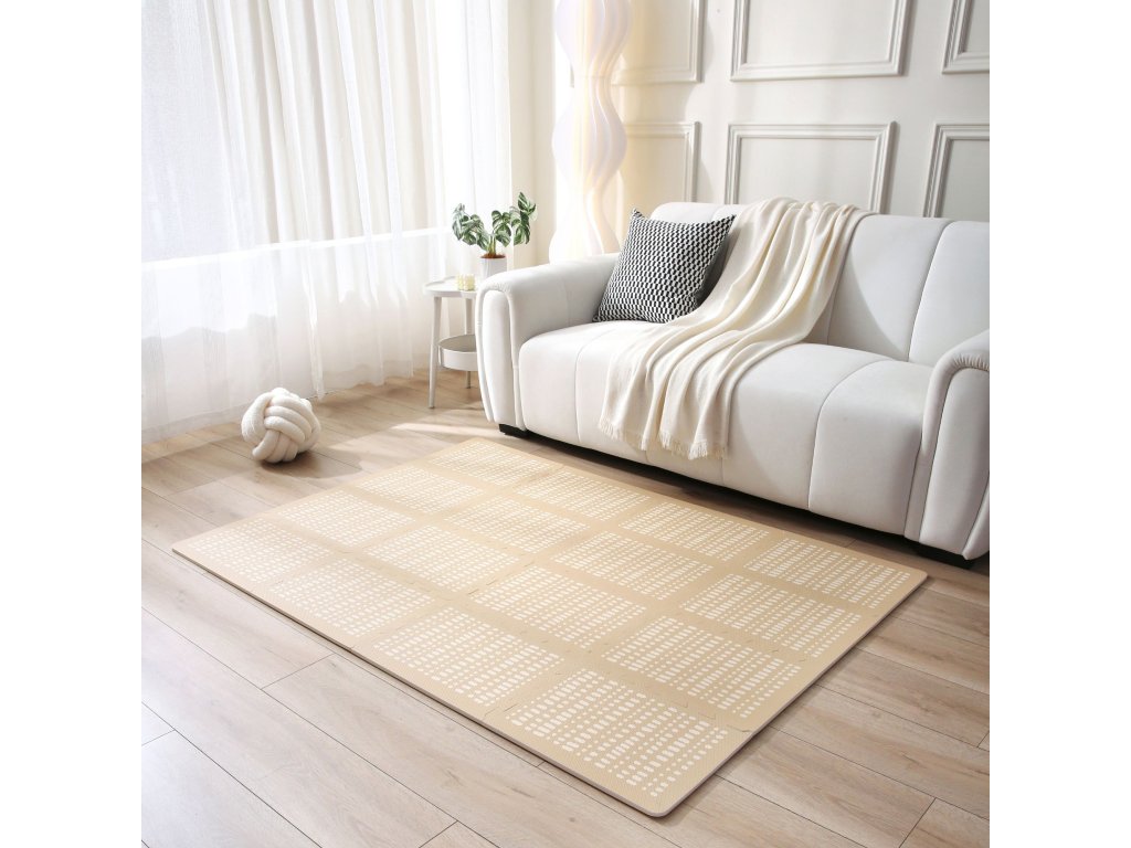 Hracia podložka Puzzle XL Hygge Sandstone 1.7 x 1.2 m Hravá a pohodlná puzzle podložka Extra veľká hracia podložka Puzzle XL v pieskovej farbe sa skladá zo 16 penových štvorcov, ktoré sú 4x väčšie ako klasické puzzle diely, preto poskytuje štvornásobok priestoru na plazenie, hranie a detské dobrodružstvá. S elegantnou pieskovou farbou a ručne kreslenými motívmi konfiet podložka nielenže ozdobí detskú izbu, ale poskytne aj pohodlný "vankúš" na tvrdých podlahách. Vďaka bezpečnému spojeniu sú dosky blízko seba, takže deti sa môžu bezstarostne hrať a objavovať svet okolo seba.Bezpečná hracia podložka pre najmenších Hracia podložka v pieskovej farbe je vyrobená z kvalitnej EVA peny, ktorá je hrubá 1,2 cm a o 20% mäkšia a teplejšia ako iné alternatívy, čo zabezpečuje pohodlné a bezpečné hranie. Podložka je vodeodolná a jednoducho ju vyčistíte mydlom a handričkou, takže ju môžete používať nielen doma, ale aj vonku. Navyše, je 100% bez zápachu a neobsahuje nebezpečné látky ako formamid, BPA a ftaláty.
