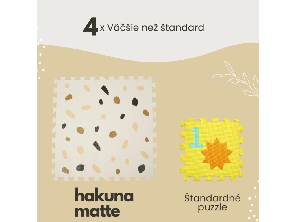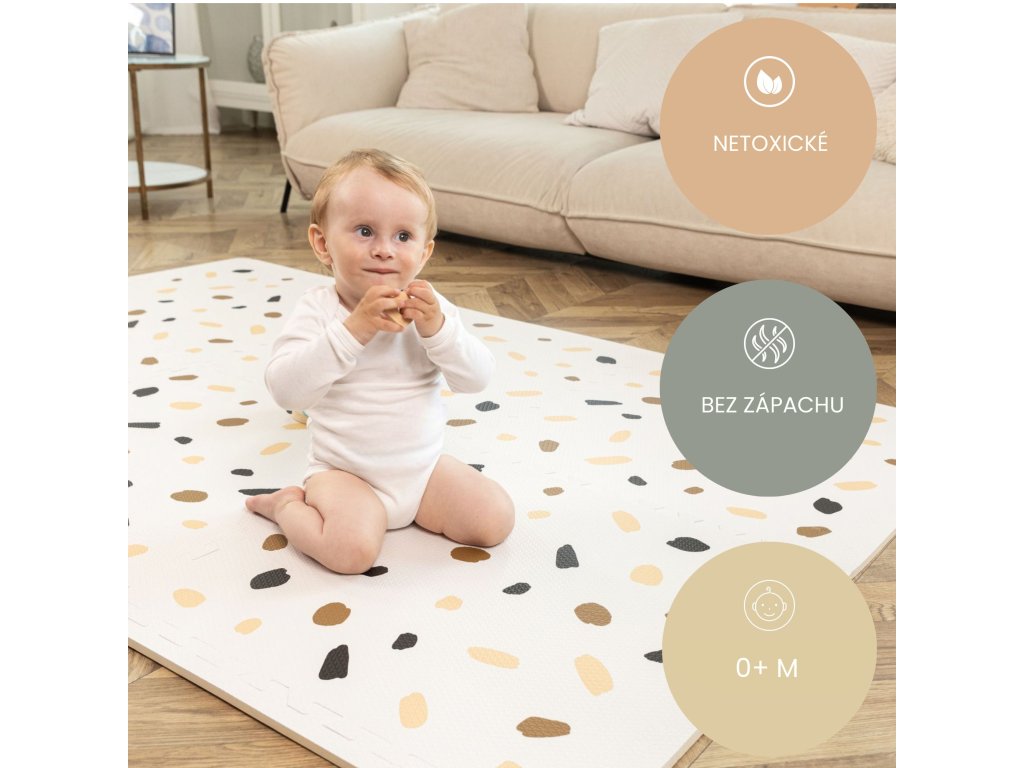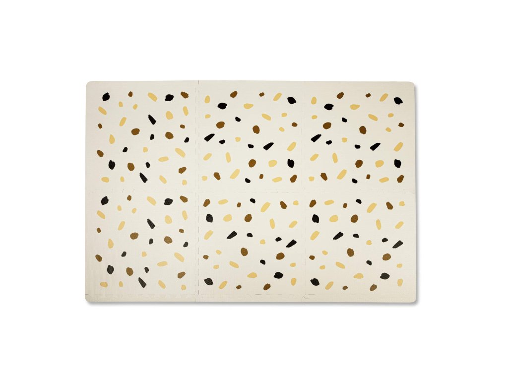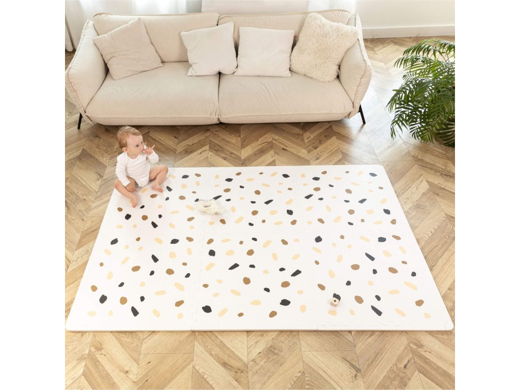 Hracia podložka Puzzle XXL Confetti 1.8 x 1.2 m Hravá a pohodlná puzzle podložka s motívom konfiet Extra veľká hracia podložka Puzzle XXL Konfety sa skladá z 6 penových štvorcov, ktoré sú 4x väčšie ako klasické puzzle diely, preto poskytuje štvornásobok priestoru nielen na plazenie, hranie a detské dobrodružstvá, ale aj pre rôzne rodinné aktivity. Využijete ju aj na jogu, športové cvičenia či dokonca piknik v prírode. Vďaka štýlovým pastelovým farbám a elegantným ručne kresleným motívom konfiet podložka dokonale doplní každú detskú izbu. Všetky puzzle diely do seba pevne zapadajú a poskytujú tak pohodlný "vankúš" aj na tvrdých a studených podlahách.Bezpečná hracia podložka pre najmenších Hracia podložka v krásnych pastelových farbách je vyrobená z kvalitnej EVA peny, ktorá je hrubá 1,2 cm a o 20% mäkšia a teplejšia ako iné alternatívy, čo zabezpečuje pohodlné a bezpečné hranie. Podložka je vodeodolná a jednoducho ju vyčistíte mydlom a handričkou, takže ju môžete používať nielen doma, ale aj vonku. Navyše, je 100% bez zápachu a neobsahuje nebezpečné látky ako formamid, BPA a ftaláty.