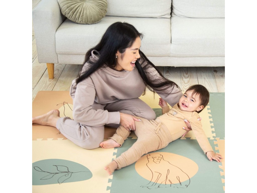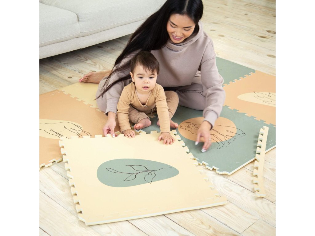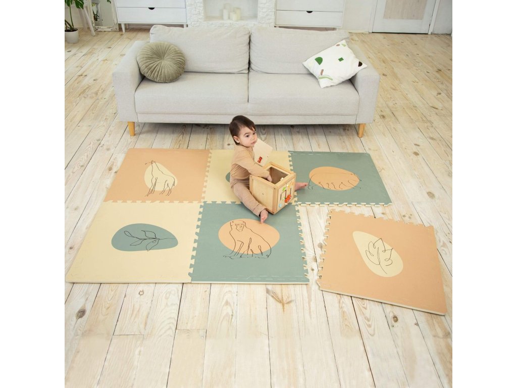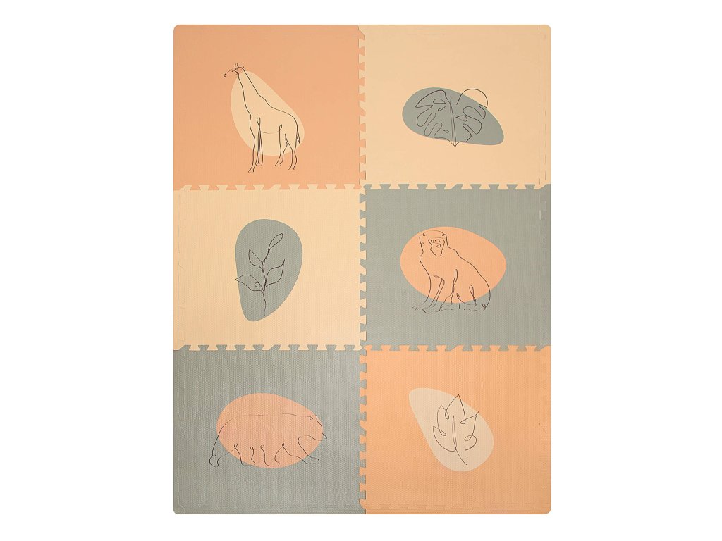 Hracia podložka Puzzle XXL Džungľa 1.8 x 1.2 m Hravá a pohodlná puzzle podložka s motívom džungle Extra veľká hracia podložka Puzzle XXL Ďungľa sa skladá z 6 penových štvorcov, ktoré sú 4x väčšie ako klasické puzzle diely, preto poskytuje štvornásobok priestoru nielen na plazenie, hranie a detské dobrodružstvá, ale aj pre rôzne rodinné aktivity. Využijete ju aj na jogu, športové cvičenia či dokonca piknik v prírode. Vďaka štýlovým pastelovým farbám a elegantným ručne kresleným motívom zvieratiek a rastlín z džungle podložka dokonale doplní každú detskú izbu. Všetky puzzle diely do seba pevne zapadajú a poskytujú tak pohodlný "vankúš" aj na tvrdých a studených podlahách.Bezpečná hracia podložka pre najmenších Hracia podložka v krásnych pastelových farbách je vyrobená z kvalitnej EVA peny, ktorá je hrubá 1,2 cm a o 20% mäkšia a teplejšia ako iné alternatívy, čo zabezpečuje pohodlné a bezpečné hranie. Podložka je vodeodolná a jednoducho ju vyčistíte mydlom a handričkou, takže ju môžete používať nielen doma, ale aj vonku. Navyše, je 100% bez zápachu a neobsahuje nebezpečné látky ako formamid, BPA a ftaláty.