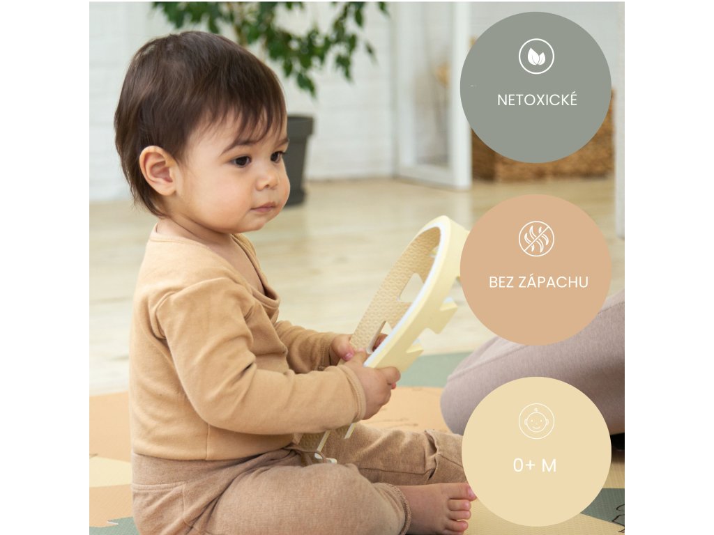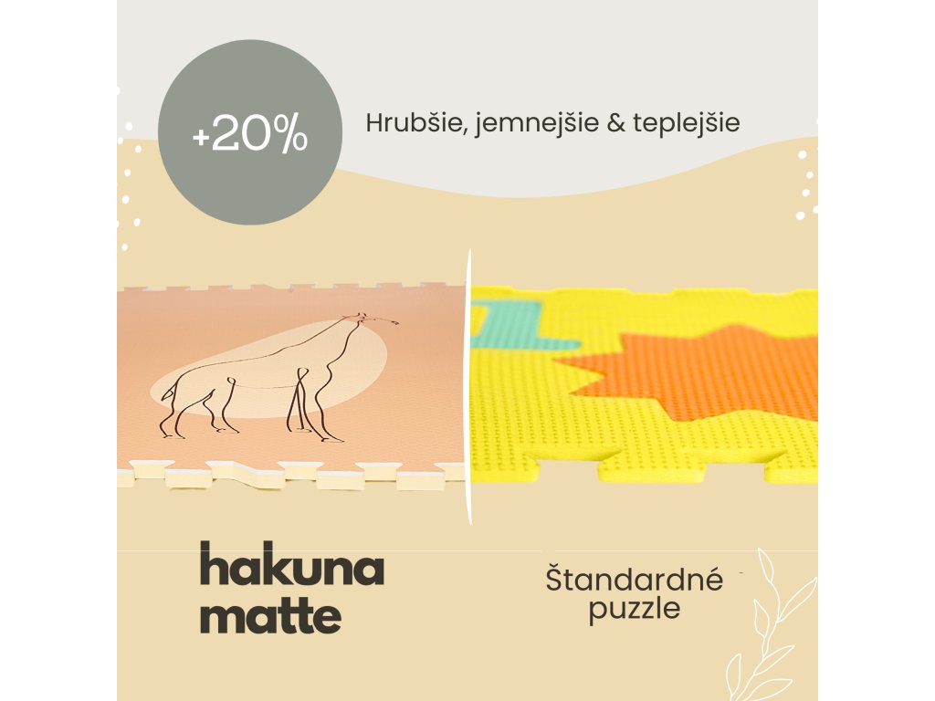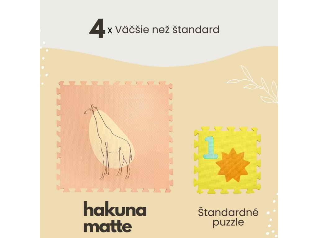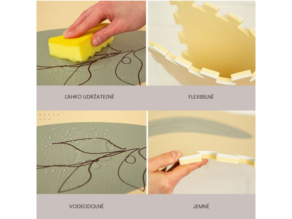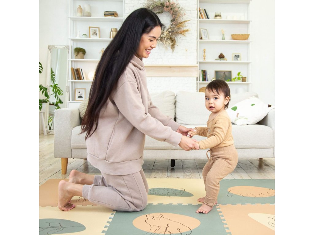 Hracia podložka Puzzle XXL Džungľa 1.8 x 1.2 m Hravá a pohodlná puzzle podložka s motívom džungle Extra veľká hracia podložka Puzzle XXL Ďungľa sa skladá z 6 penových štvorcov, ktoré sú 4x väčšie ako klasické puzzle diely, preto poskytuje štvornásobok priestoru nielen na plazenie, hranie a detské dobrodružstvá, ale aj pre rôzne rodinné aktivity. Využijete ju aj na jogu, športové cvičenia či dokonca piknik v prírode. Vďaka štýlovým pastelovým farbám a elegantným ručne kresleným motívom zvieratiek a rastlín z džungle podložka dokonale doplní každú detskú izbu. Všetky puzzle diely do seba pevne zapadajú a poskytujú tak pohodlný "vankúš" aj na tvrdých a studených podlahách.Bezpečná hracia podložka pre najmenších Hracia podložka v krásnych pastelových farbách je vyrobená z kvalitnej EVA peny, ktorá je hrubá 1,2 cm a o 20% mäkšia a teplejšia ako iné alternatívy, čo zabezpečuje pohodlné a bezpečné hranie. Podložka je vodeodolná a jednoducho ju vyčistíte mydlom a handričkou, takže ju môžete používať nielen doma, ale aj vonku. Navyše, je 100% bez zápachu a neobsahuje nebezpečné látky ako formamid, BPA a ftaláty.