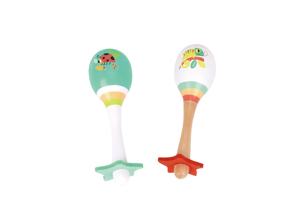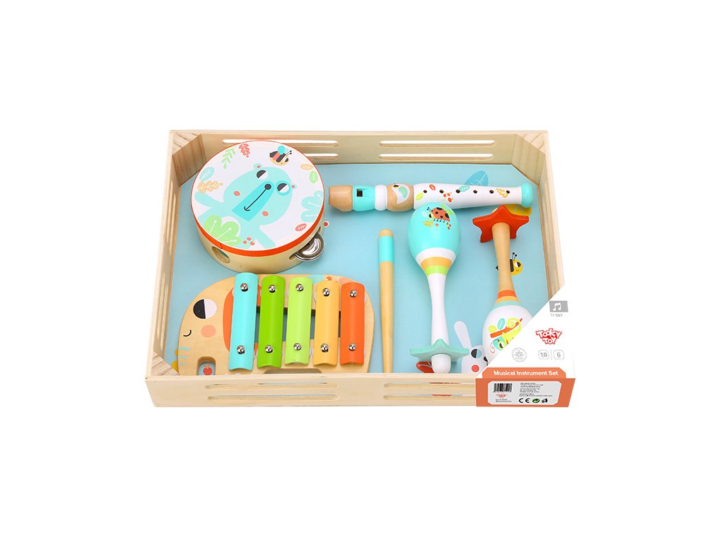 Hudobná sada Zvieratká Deti sa hudbu naučia milovať. Hudobná sada Zvieratká pozostáva zo štyroch hudobných nástrojov a rytmických hračiek uložených v drevenom boxe. Jednotlivé hudobné nástroje sú vyhotovené s motívmi rozkošných zvieratiek a v krásnych farebných tónoch, ktoré spolu ladia. Sada obsahuje xylofón, rumba gule, flautu a tamburínu.Rozvíjajú si koordináciu a zmyslové vnímanie. Hudobné nástroje upevňujú vzťah detí k hudbe a cvičia rytmické zručnosti dieťaťa. Rozvíjajú schopnosť koordinovať svoje pohyby a zlepšuje ich koncentráciu. Podporujú detskú tvorivosť experimentovaním s rôznymi variáciami zvukov.