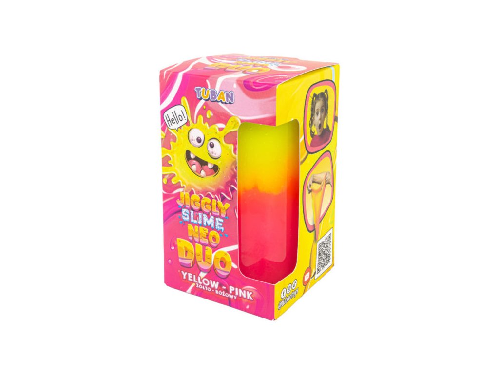 Jiggly Slime Sliz NEO DUO žlto ružový 430 g Absolútne slizové šialenstvo Jiggly Slime je žlto ružový sliz s úžasnou textúrou pripravený na okamžitú hru. Hra so slizom je ideálna na rozvoj jemnej motoriky, zmyslového vnímania a podporuje u detí kreativitu. Deti ho môžu naťahovať, tvarovať, stláčať. Sliz ponúka nekonečné možnosti kreativity a hry. Každé dieťa miluje objavovanie nových textúr a materiálov a sliz bude určite jedným z najobľúbenejších.Kvalitné a bezpečné slizy Pre deti môže byť manipulácia so slizom taktiež upokojujúca a relaxačná. Je to skvelý spôsob, ako si oddýchnuť a znížiť stres po náročnom dni. Objavte všetky Jiggly slimes rôznych farieb a vôní. Sliz je vyrobený z bezpečných a netoxických materiálov, ktoré sú šetrné k životnému prostrediu, neobsahujú borax. Balenie: 430 gSenzorická hra umožňuje deťom objavovať svet okolo seba prostredníctvom zmyslov Hranie s rôznymi textúrami, farbami a vôňami nielenže stimuluje ich zmyslové vnímanie, ale taktiež podporuje ich kognitívny vývoj, jemnú motoriku a emocionálnu inteligenciu. S produktmi značky Tuban môžu deti preskúmavať rôzne senzorické podnety a objavovať nové spôsoby učenia a zábavy.
