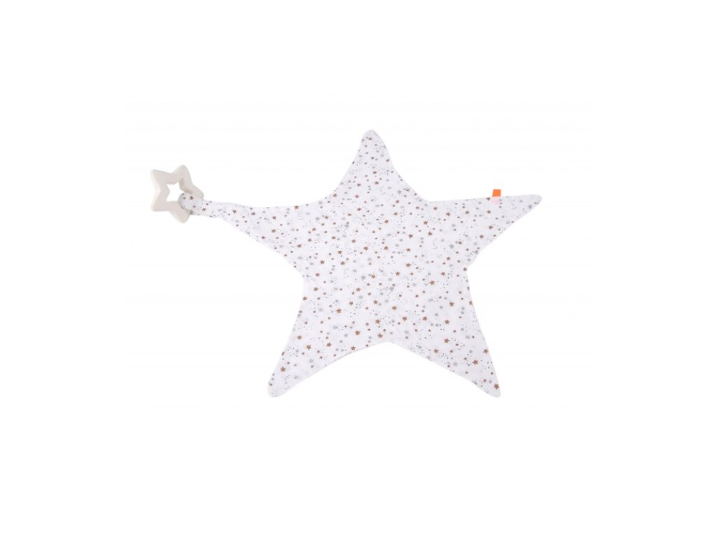 Jemná textilná hračka s odnímateľným hryzátkom v tvare hviezdičky, vyrobená z prírodného kaučuku.