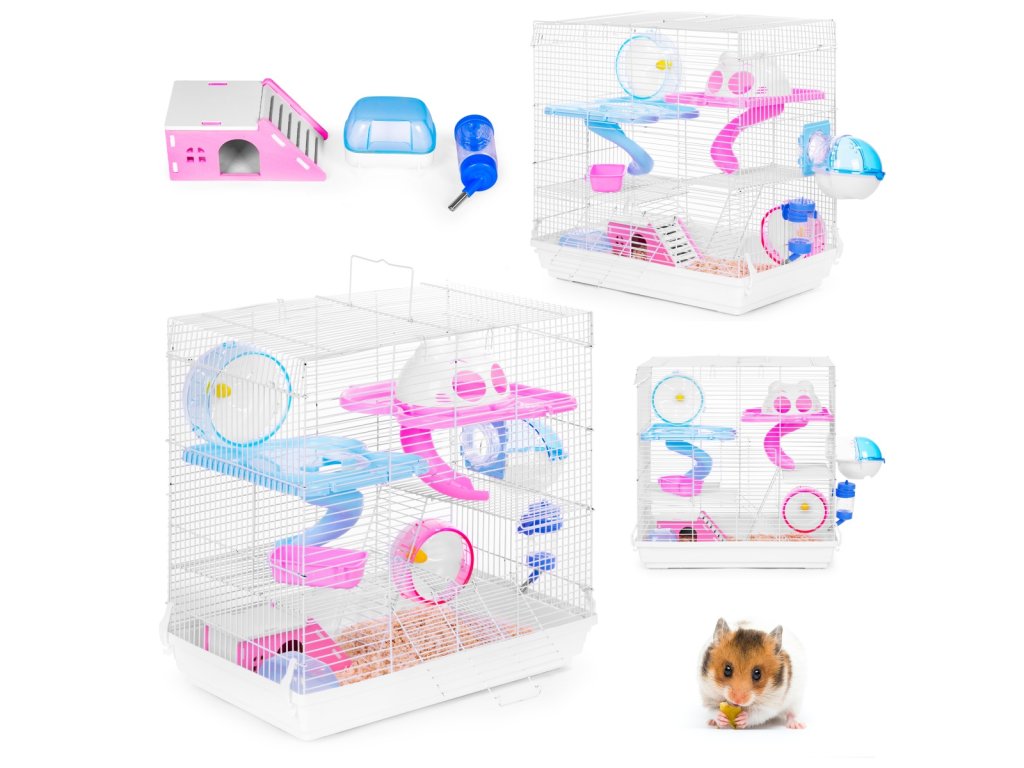 Súčasťou klietky sú dve šmykľavky, domček, kolotoč, štyri poschodia, miska a napájadlo.