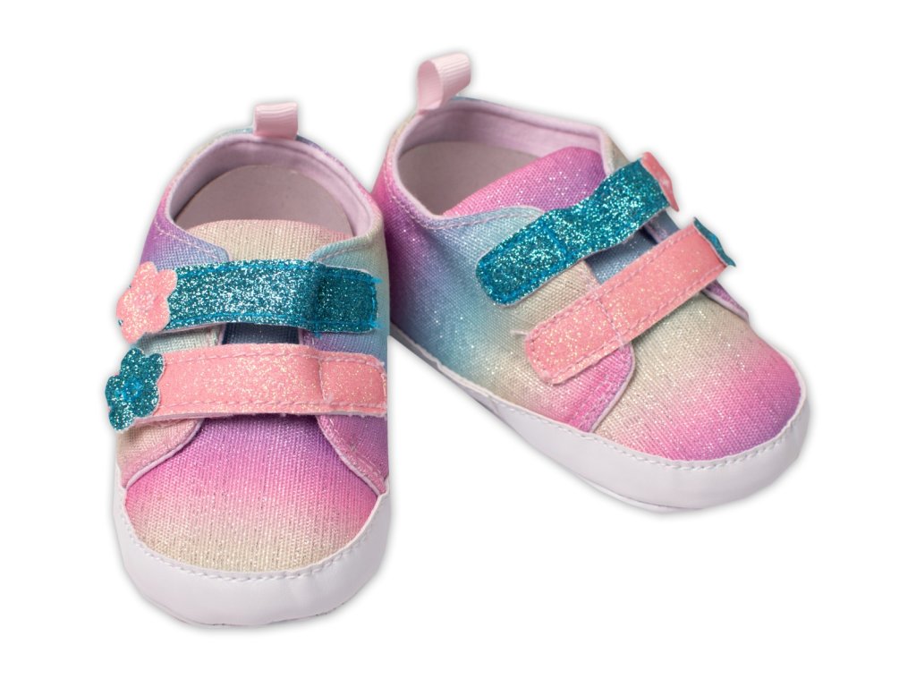 Roztomilé dívčí boty v duhových, pastelových barvách. Zdobené třpytkami. Ideální pro každodenní styling. Díky zapínání na suchý zip perfektně padnou na dětskou nohu.