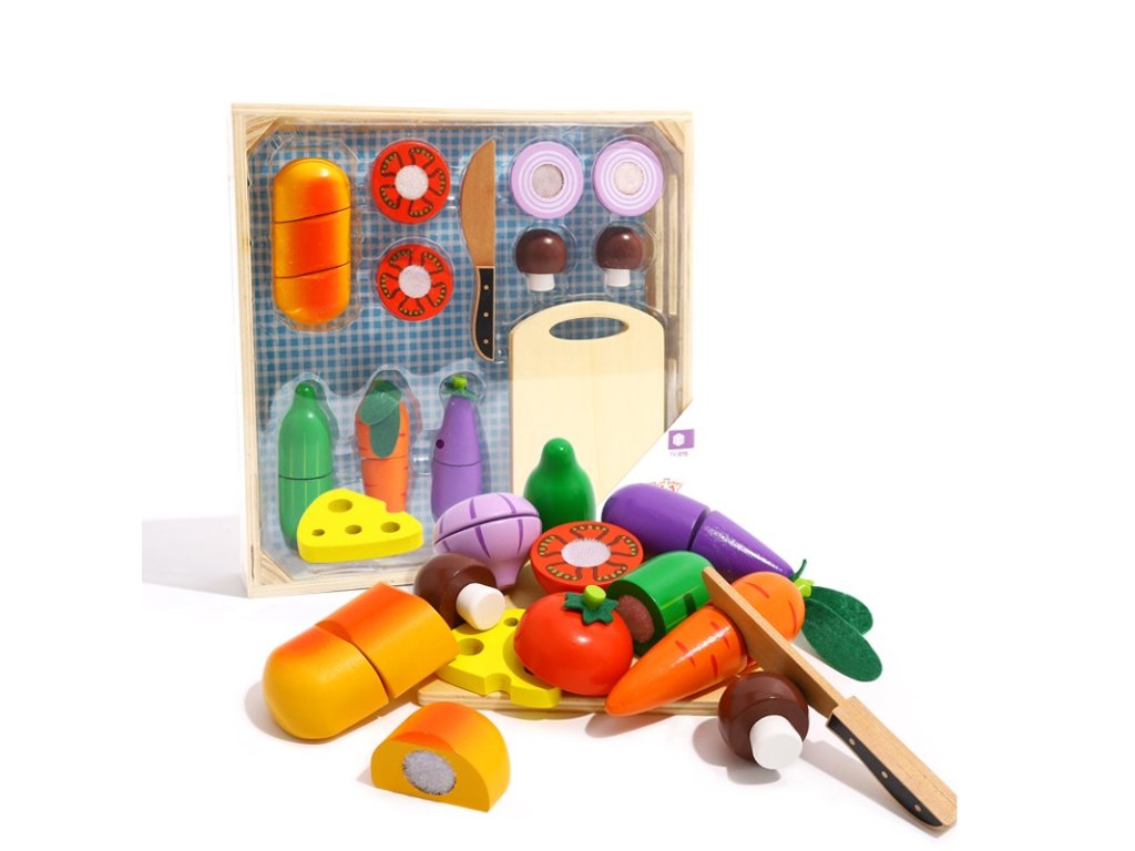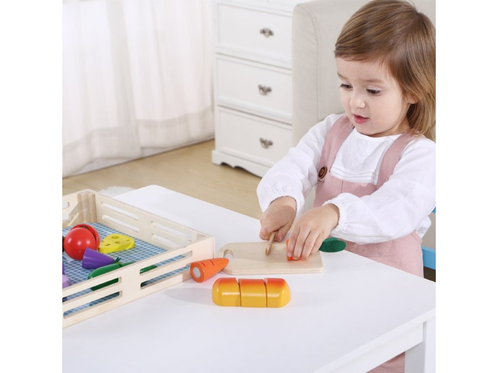 Krájanie Zelenina v debničke Pripravíme zdravé jedlo! Drevené potraviny na suchý zips vhodné pre každého malého kuchára. Súčasťou balenia je nožík na krájanie. Deti si pri hre cvičia jemnú motoriku. Učia sa tiež hrať sa samostatne, rozvíjajú si slovnú zásobu, získavajú sebavedomie a kladný vzťah k zdravému jedlu a vareniu.