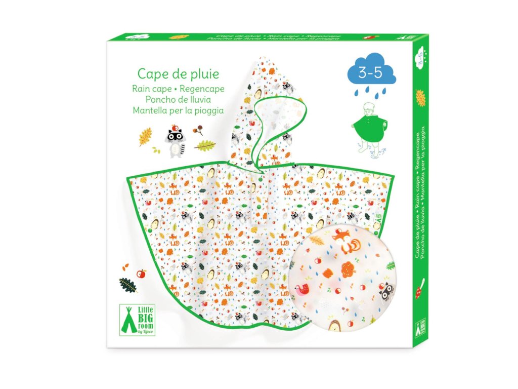 Praktický a štýlový pršiplášť od Djeco pre deti od 3-5 rokov. Pončo je z príjemne mäkkého, polopriesvitného plastu s potlačou s malými lesnými motívmi. Kapucňa je napevno, neodopína sa. Na rukávoch a na výstrihu má zapínanie na cvoky. Po celom obvode je obšité textilným lemom.