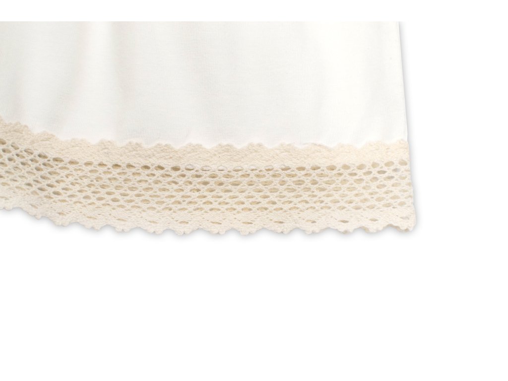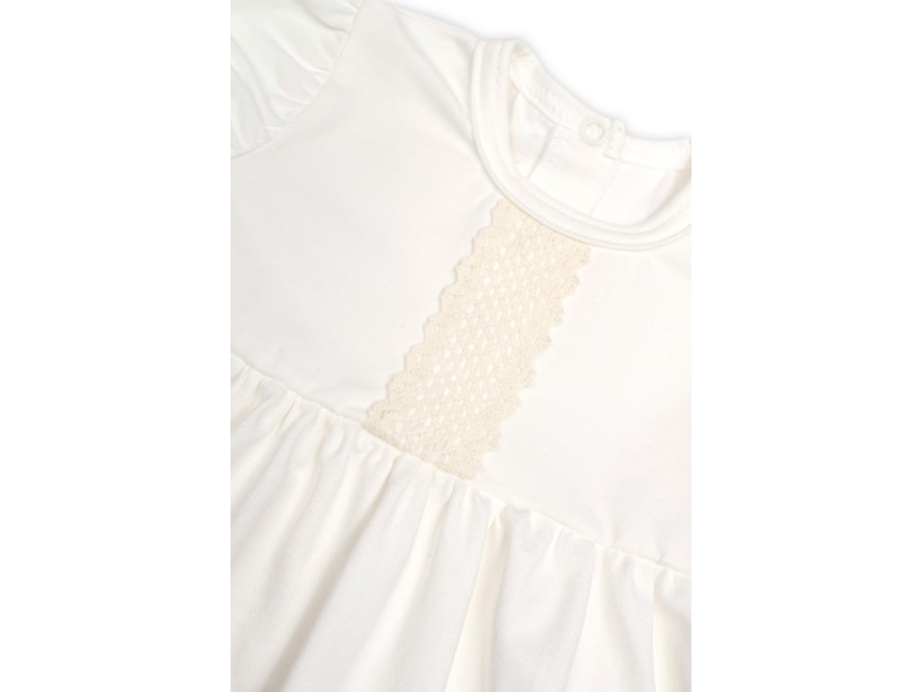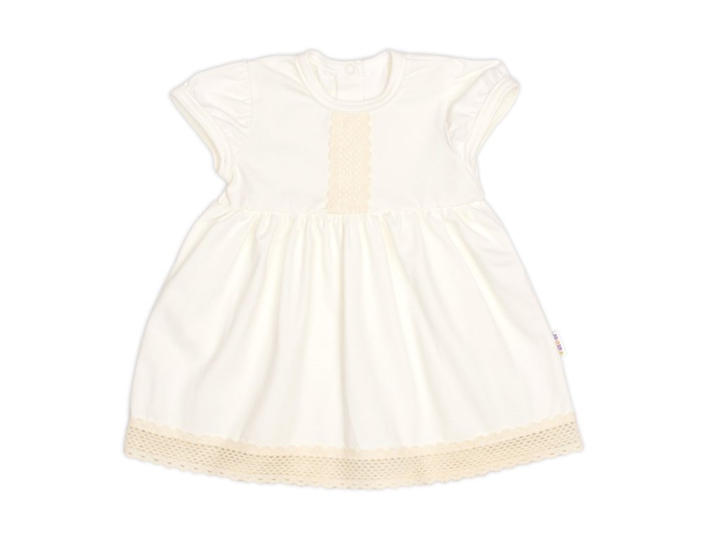 Bavlněné šatičky v jemně smetanové barvě s jemným krajkovým zdobením a krátkým rukávem.