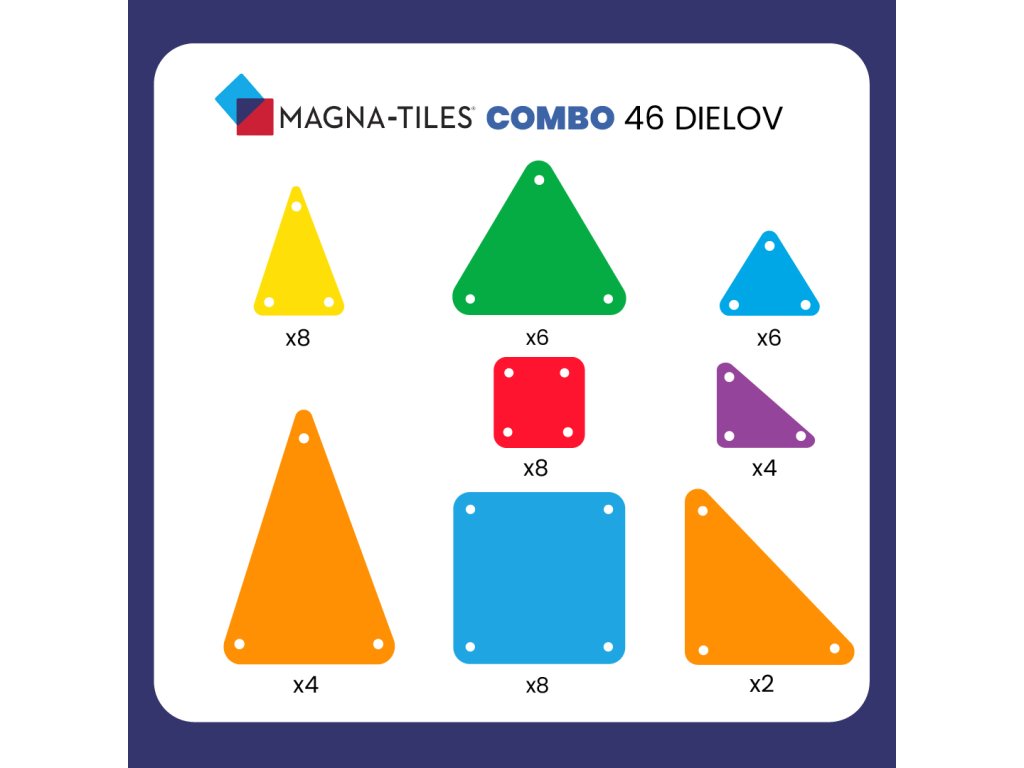 Magnetická stavebnica Combo 46 dielov Kombinácia veľkých a malých dielikov pre viac kreatívnych možností MAGNA-TILES Combo je originálna magnetická stavebnica, ktorá zaujme každého malého staviteľa.Sada prináša dokonalé spojenie medzi microMAGS a klasickými dielikmi MAGNA-TILES.V sade nájdete 20 klasických dielikov a 26 zmenšených dielikov magnetickej stavebnice.MicroMAGS sú o 75 % menšie ako klasické diely, čo prináša ešte viac možností a podporuje rozvoj jemných motorických zručností.Stavebnica je plne kompatibilná so všetkými ostatnými súpravami MAGNA-TILES.Zmysluplná stavebnica pre malých staviteľov Stavebnica je nielen praktická, ale aj vysoko kvalitná a bezpečná. Dieliky sú vyrobené z potravinárskeho, netoxického plastu, ktorý neobsahuje BPA, ftaláty ani latex. Silné magnety a pevná konštrukcia zabezpečujú dlhú životnosť a nekonečné hodiny tvorivej zábavy. Táto stavebnica podporuje rozvoj jemných motorických zručností, koordinácie ruka-oko a kreativity, čo z nej robí ideálny darček pre deti vo veku už od 3 rokov.Sada obsahuje 46 magnetických dielikov:4x pravý trojuholník microMAGS,6x rovnostranný trojuholník microMAGS,8x štvorec microMAGS,8x rovnoramenný trojuholník microMAGS,2x pravý trojuholník,4x rovnoramenný trojuholník,6x rovnostranný trojuholník,8x štvorec.