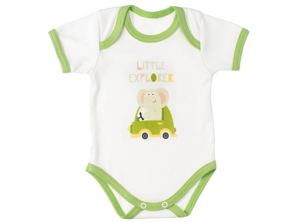 MBaby Bavlněné body s krátkým rukávem, Slůně Little Explorer, bílo/zelené