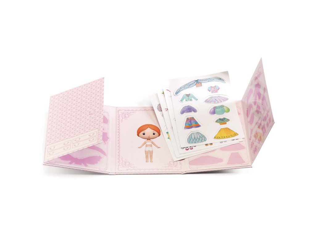 Šatník Miss Lilyruby v roztváracej mapke. V šatníku je miesto pre 8 outfitov, dovedna 40 ks opakovane odlepiteľných vinylových samolepiek. Prehľadná roztváracia mapka má 5 strán. Sada dáva možnosť ponoriť sa hlbšie do krásneho sveta Tinyly. Hodí sa na cestovanie alebo na skrátenie čakania.